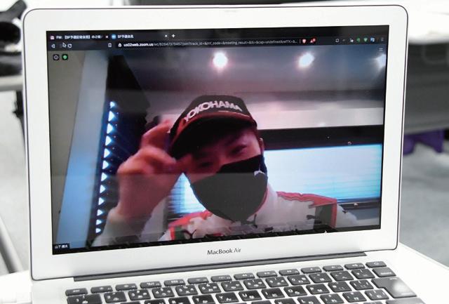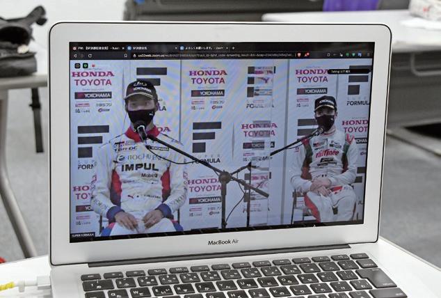 本大会では、スタート進行の際に「エグゼクティブスイート」チ ケット所持者を対象とした「グリッドスルー」と呼ばれる新たな試 みが行われていた。これは従来のグリッドウォークとは異なるも ので、係員の指示や誘導に従いグリッドの周囲を遠巻きに1周す るといった行為。参加選手との接触は禁じられており、チケット所 持者同士の距離も確保しての実施となった。 スーパーフォーミュラの決勝後の記者会見はオンライン配信 され、遠隔地のメディアでも視聴できるようになっていた。優 勝者と入賞者の距離は確保され、写真のような前後配置に。 開幕戦もてぎで3位表彰台を獲得した山下健太選手。自己隔 離期間につき表彰式には参加できなかったため、記者会見で はキャンピングカーからオンラインでコメントを寄せた。 幸運にも入国が叶ったタチアナ・カルデロン選手。規定の自 己隔離期間を経て大会に挑み、ドラゴ・コルセ12号車に乗 車。最終周回では山本尚貴選手とのドッグファイトを演じた。 13