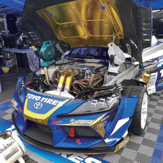 選手だ。トヨタのV8エンジン3UZを大幅モディファ イして搭載したA90スープラで挑んだ2シーズン目、 今年の開幕戦奥伊吹でついに優勝を飾ったのだ。 このエンジンは北米ではメジャーな改造ベースとさ れており、排気量アップや耐久性の高いエンジンパー ツが存在するため、注目を浴びている存在だ。 北米フォーミュラドリフトの参戦車両を見ると、ベ ース車両に関わらず、アメリカンV8(LS7など)を搭載