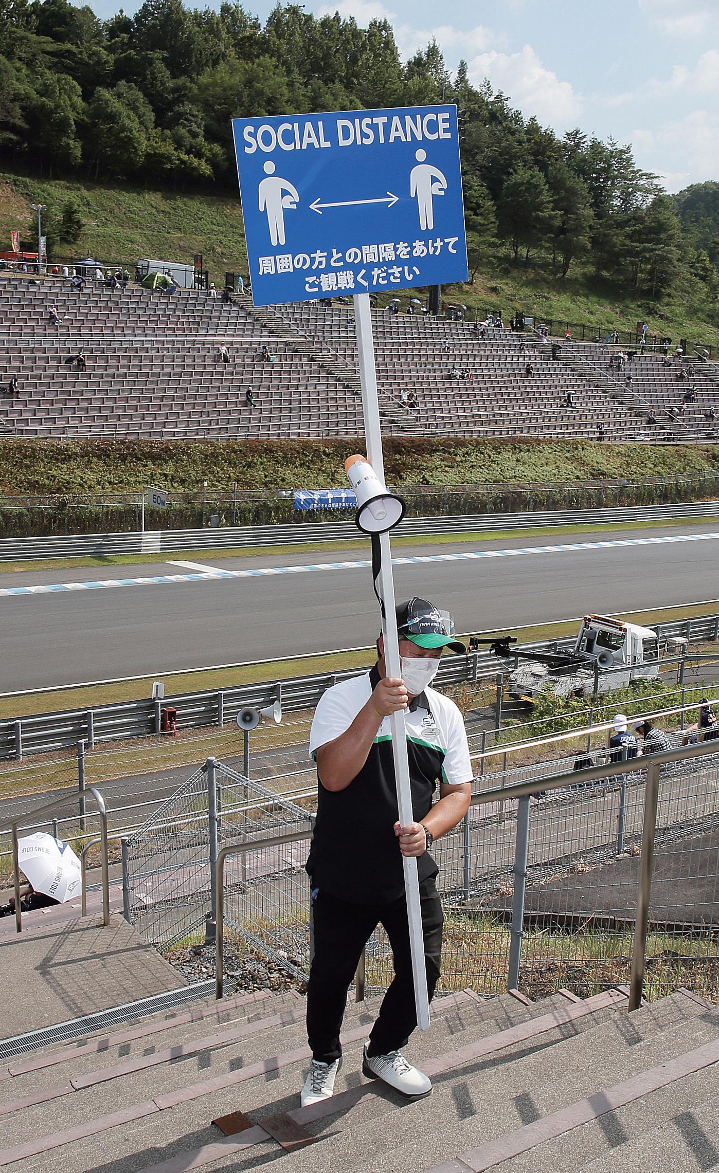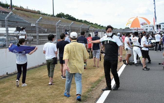 アが完全に仕切られていた。ツインリンクもてぎで開 催された開幕戦の場合は、関係者は「北ゲート」を使用 して、入場直後にリストバンドを装着。これを目印に して、サーキットにおける各種入場パスを目視確認す る際の、係員との接触を避けられるようになっていた。 施設利用者やレースの観客は「南ゲート」からの入場 となったが、パドックへの立ち入りは禁止され、従来 型のピットウォークやグリッドウォーク、イベントス テージなどは実施されないことになった。 ギャラリースタンドでは、係員が巡回して観客同士 が密集しないように呼びかけるなど、サーキットを運 営するモビリティランドも感染拡大防止対策を徹底し ていた。当然のことながら、観客にも入場の際には検 温などを義務付けられており、JRPやモビリティランド