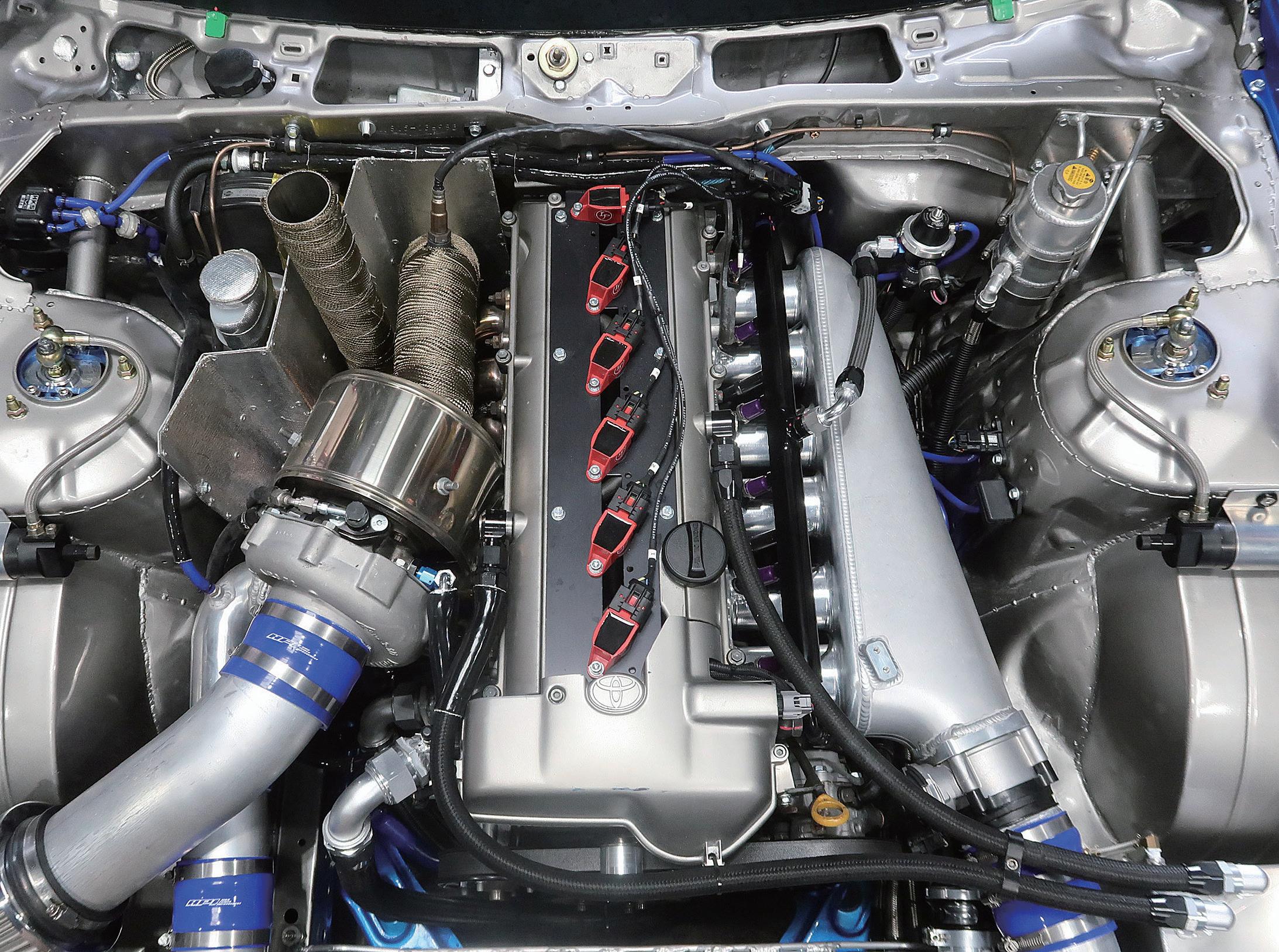 D1GPでは2JZワンメイク状態!? 現在、ドリフトで選ばれるエンジンの代表格は、丈 夫で市販パーツも多い「2JZ」。元はJZA80スープラや JZS147/161アリストに載っていた3Lターボだ。 これをボアアップ(ピストン大径化)&ストロークア ップ(クランクシャフト交換)で3.4Lや3.6Lに排気量 アップ。そこに大型タービンをドッキングする。