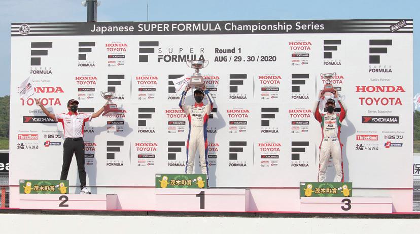 作動させていたが、それを封じるのが狙いだ。 選手によっては、ライバルとのギャップを稼ぐため、 ピットに入る前のインラップなどにも使用しているが、 一度使うと100秒間は再使用できない。第2戦岡山大 会では、こうした各選手による使用方法の違いもあり、 迫力あるオーバーテイクシーンが演じられた。 そして、第2戦では、欠場選手の代役として複数の 若手がスーパーフォーミュラに参戦した。彼らの予選 の走りはとても印象的で、スーパーフォーミュラ・ラ イツとダブル参戦となった宮田莉朋選手がいきなりフ ロントローを獲得するなど、嬉しい驚きもあった。 夏を終えて、世界的、特に欧州ではCOVID-19の 再流行が強く懸念されており、外国人ドライバーが来 日してレースをすることは難しくなるかも知れない。 だが、国内では着々と次の才能が芽吹いてきている。 未知の感染症の影響でモータースポーツの未来は不透 明ではあるが、日本のフォーミュラレース界にとって は、決して悪い要素ばかりではなさそうだ。 スーパーフォーミュラ 5か月遅れの開幕戦 35周、最大70分と短縮された開幕戦もてぎの勝者は平 川亮選手。第2戦岡山大会は51周、最大75分とされ、タ イヤ交換義務が復活した。オーバーテイクを繰り返して 順位を上げた坪井翔選手が嬉しい初勝利を挙げている。 ソーシャルディスタンスを確保した開幕戦もてぎの表彰台。3位入賞の山下健太 選手の代わりに登壇したのは近藤真彦監督。 14