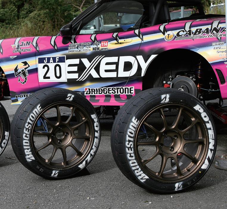 負になっているのだ。 これは、タイヤの進化とそれを活かすトラクション 性能が格段に上がったことと、アンチラグシステム(ア クセルオフ時のターボラグを消す制御で、ミスファイ アリングシステムとも言う)の導入のおかげ。 如何なる状況でもカウンターを当てた姿勢作りがで き、止まりそうなスピードから一気に車速を乗せるこ ともできるようになってきた。「単走」はもちろん「追走」 でも、勝ち抜くためには 「ちょうどいい馬力」ではお 話にならない時代になって きている。 500馬力に満たないエン ジンが全盛の15年前なら、 協賛メーカーのハイグリッ プタイヤをプロモーション のために装着し、グリップを落とすためにタイヤの空 気圧を高圧にセットする手法も多く見られたが、今で はその逆。ハイグリップタイヤをさらにグリップさせる