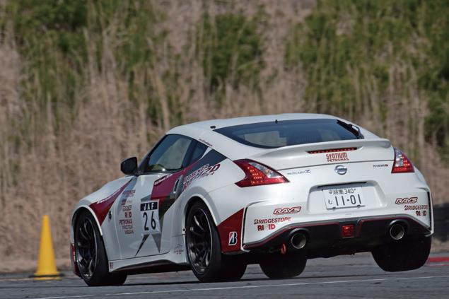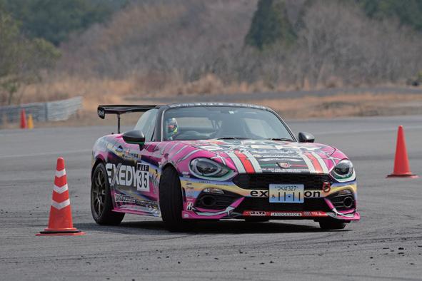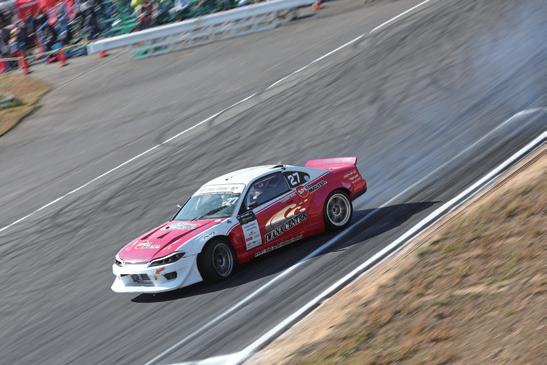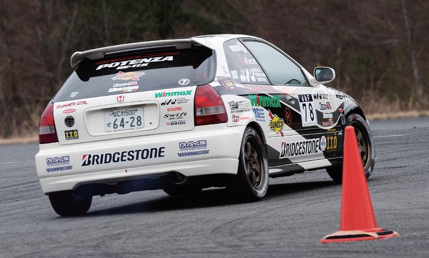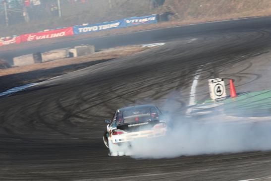 て、「ドリフトモーションをどの地点で開始 したか」、「コース幅を大きく使って果敢に 攻めていたか」、そして「コーナーの向きが 変わる時にカウンターステアを的確に当て て直しているか、車速が落ちていないか」な どを評価している。 また、コース外走行をどこまで許容する かなどを含めて、走行ラインが制限される こともある。上位に食い込むためには、評 価区間の区間タイムの速さも重要となって いる。派手なアクションだけではなく、車 速の高さも要求されているのが現状だ。 コ ース幅を大きく使い、次のコーナーに対して車 速を稼げているか。カウンターステアがフラフ ラと戻ったりしていないか。スピンモードに陥っていないかが評価される。車体に角度が 付いてから、アクセルオンまでの反応の早さや踏み込む量などもポイントだ。 右コーナー進入の同地点で撮影。左車両は手前から車体が横を向いているが、右車両はここから角度が増 していくと思われる。最終的に同じ角度に到達しても、早く最大角に到達する方が難易度が高く得点も高い。 エビスサーキット西コースで開催されたD1グランプリの事例。 「 振り出し 」 「コーナリング 」 荷 重移動の後にサイドブレーキを使うかクラッチ を蹴るかで、角度の付き方やその後の加速(減 速)感が違ってくる。また、進入の振り出し地点までのライン取りで、車速を落とさない努 力をしたどうかも判断材料となり、より難易度の高い走りが高得点となる。 得点高 得点低 左 右のコーナーが連続するS字コーナーなどでは、途中で異なる方向に車体の向きを変える必要があ る。そういった状況においては、変わるコーナーの曲率に対して的確にカウンターを当て直している か、車速の極端な落ち込みがないかどうかなどが評価される。 コーナー進入後は最大角度を安定させて、コーナリン グするための再加速地点までキレイにラインに乗せ ていく。写真はサイドブレーキで後輪をロックさせ て、車体をアウトまで“飛ばす”テクニックを使ってい る。ロック状態があまりにも長いと失速してしまうた め、減点の対象になり得る。 コーナリング中は基本的にはアクセルオン。いかに 早めに踏んでスムーズかつ高い速度で円弧を描く かがキモ。また、インクリップをしっかり取らない と、“減速が間に合わず流されている”と判断されて 減点となってしまう。この後のS字区間のアプロー チにも響いてくるので要注意だ。 ストレート部分からコーナーに対しての角度の違い、振り返 しの鋭さは車体の向きで明らか。アクセルを入れているか どうかも白煙量で判断できるだろう。写真は日光サーキッ トの逆走(6コーナーからストレート区間)で開催された MSCチャレンジの単走。 「 振り返し」 得点高 得点低 53