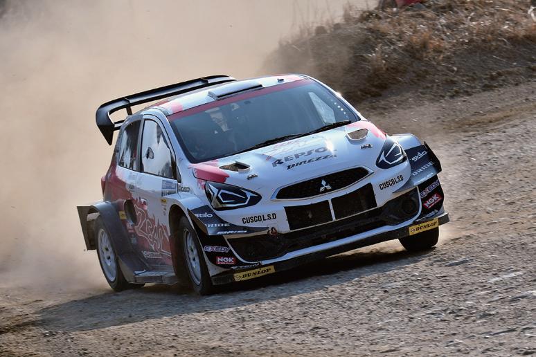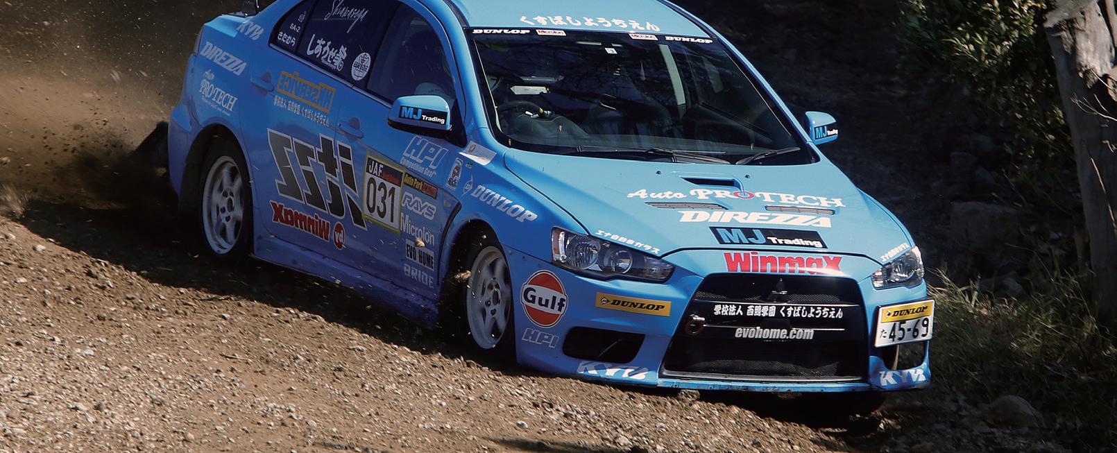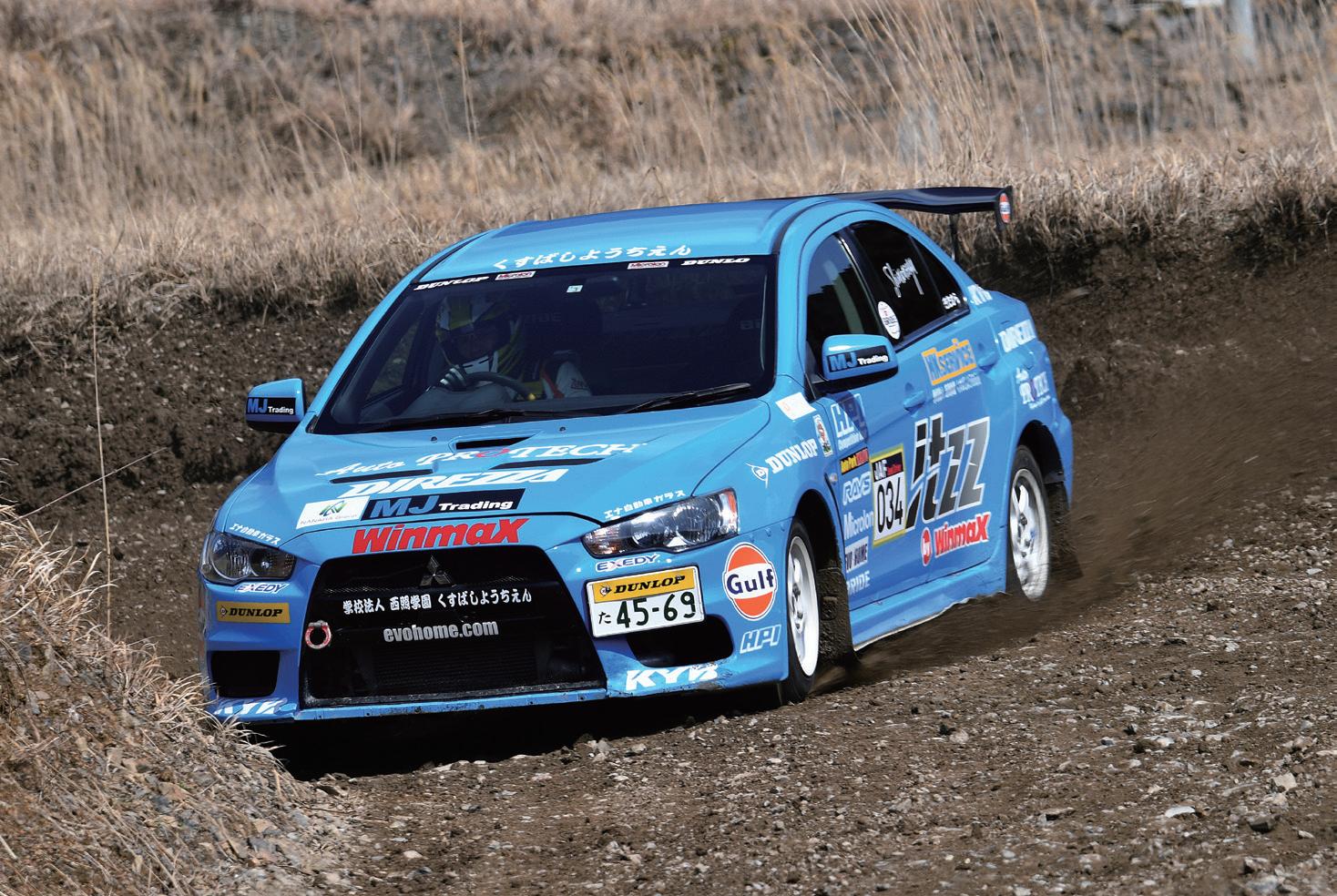JD2クラスでCZ4Aランサーエボリュ ーションXを駆る大西康弘選手もラリー出 身のドライバー。全日本ラリー選手権では 三菱使いとして名を馳せた大ベテランだ。 「僕の場合は、ラリーの走りをそのままダ ートラに持ち込んでいます。具体的には進
