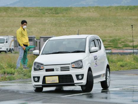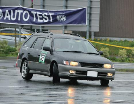 オートテストを手伝ったりしていてある程 度、経験を積んでいるし、前回がちょっと 覚えにくいと言われたので、ジムカーナの 専門家ではない彼女の方が、分かりやすい レイアウトを作れると思ったんです。ガレ ージの前のパイロンは、パイロンが1本余 ったので僕が置いてみたんです。実は、あ まり深い狙いはないんですが(笑)、やっぱ りオートテストはバックギヤを使う所が勝 負だと思うので、ジムカーナ的な勝負の要 素を加えてみた、というところでしょう か」とは今回のイベントを仕切った岩渕氏 だ。慣熟歩行では、岩渕氏は初心者ととも にコースを歩き、特にこのガレージについ ては、攻略法を詳細に解説したという。 「手前のラインまたぎで斜めに止めれば走 りやすくなるということと、後退する際 は、右のミラーだけ見てパイロンに寄せて 行けば、ガレージには入れられます、と。 左側のミラーもつい心配になって見てしま うものですが、そこで迷うぐらいなら、右 だけ見た方がロスが少なく入れられます、 というアドバイスです」。 今回、総合最小減点で優勝した村上清隆 さんは、岩渕氏と同様のジムカーナ経験者 だが、こうしたコースやライン取りの“正解” を教えることは、大いにすべき、と語る。 「コースを設定したので、あとは好きに走 って下さいというのはジムカーナでは当た