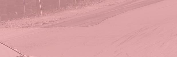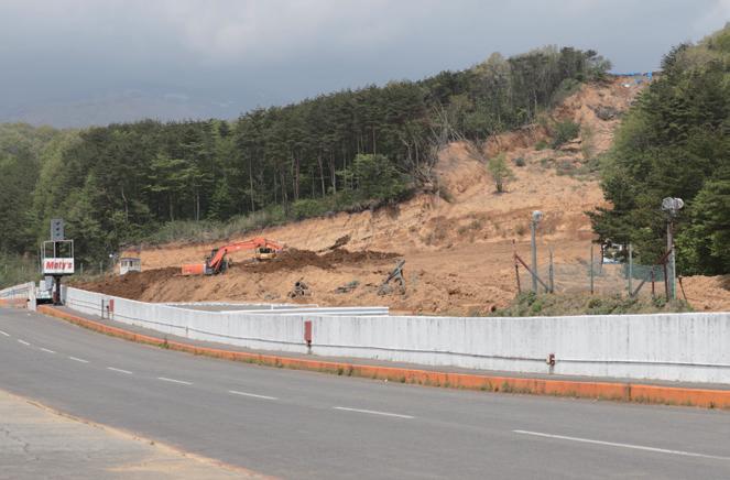 ドリフトランドの奥側はアスファ ルトがひび割れ、そこから土砂が 西コースへ雪崩れ込んだ様子。