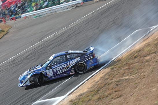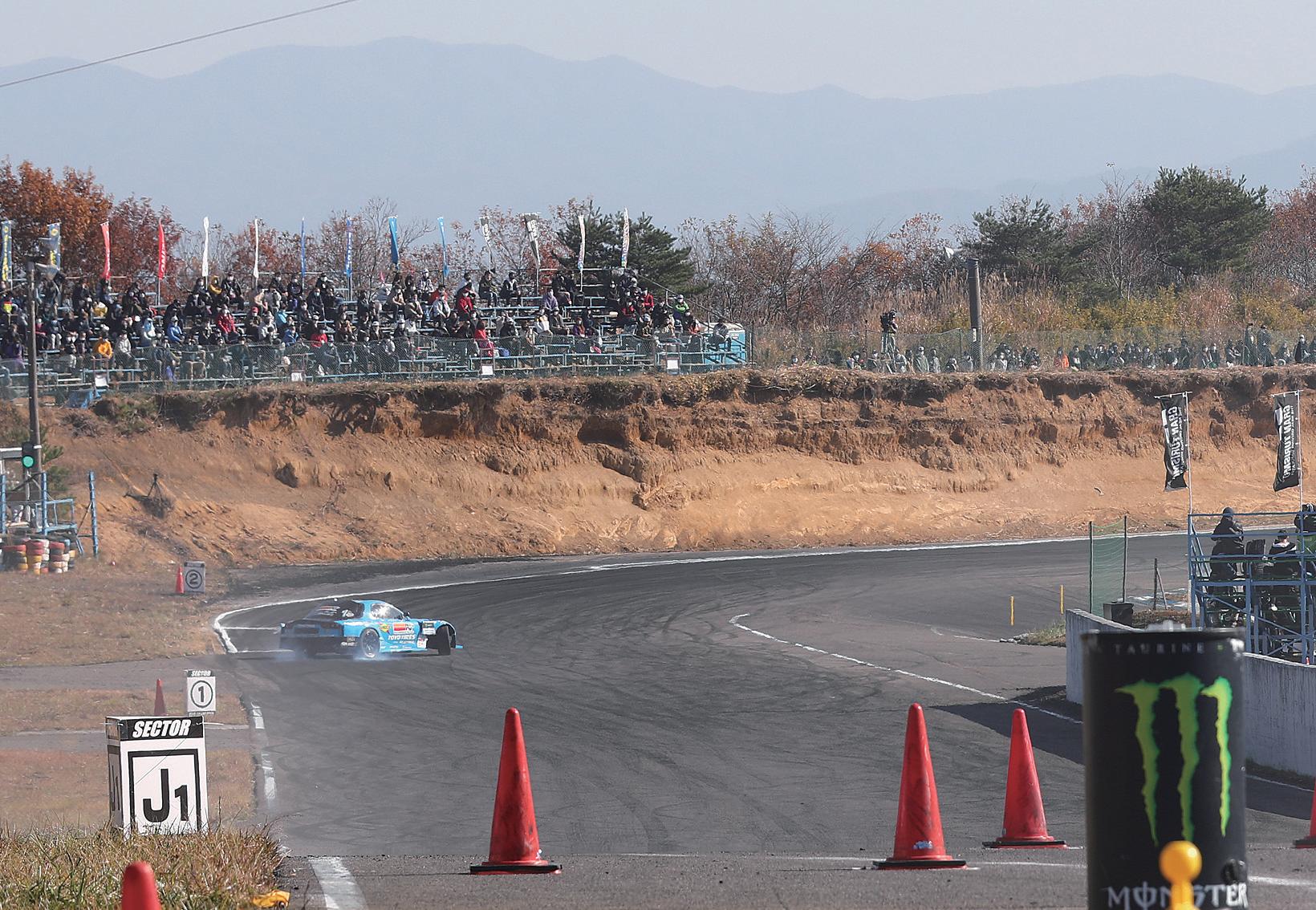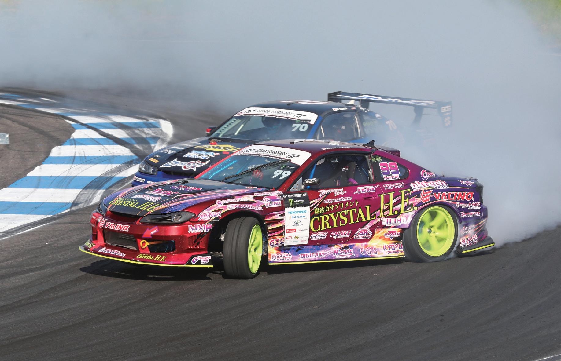 ドリフトをバトル形式に見立てた追走方 式は、2台のクルマが前後に並び、“後追い” と呼ばれる後走車が先行車の動きとシンク ロさせながら、先行車との車間距離をいか に詰められるかが見せ所となる。 1台での走行を上回るテクニックが必要 なこの方式は画期的で、観る者にも刺激的 だった。各地でドリフトコンテストが盛り 上がり、興行としても成功を収めるように なったのは、この追走のおかげと言える。 追走方式のドリフトでは、1台での走行を 「単走」と呼び、予選として機能する。その 上位者がトーナメント方式の決勝に進出し、