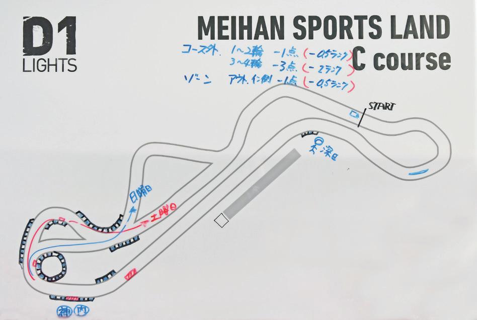 代になってきたからだ。 これらの審判員は、過去に開催コースの ドリフトコンテストで上位を獲得した上級者 (D1GPライセンス取得者など)が主催者に 指名されて担当することが多い。審判員の 過程で、他のドリフトコンテストもどんど ん採り入れていった。そして、2000年の D1グランプリ開始時から採用された「追走」 は、これまで行われてきたドリフトコンテ ストの概念を一気に変えた。 ド アウトクリップは、奥までギリギリ角度を付けてスピン に耐える走りで、この先にあるS字にアクセル全開で入 るアプローチ開始地点の目安にもなる。サーキット走行 のセオリーとは異なり、ドリフトの場合は必ずしも早めに インに付くのはベストラインとは言えない。 D1グランプリの下部リーグであるD1ライツの例。進入地点のアウト側、1コーナーのアウ ト側、2コーナーのイン側に配置されているピンク色が「ゾーン」で、リアタイヤ(もしくはリ アバンパー)を通すことが前提。外せば1箇所につき1点の減点で、コースアウトの減点も明 記される。名阪では2戦連戦で開催されたため、2種類のレイアウトが描かれている。 筑波サーキットで開催されたD1グランプリのドライバーズブリーフィング。練習 走行の前に審判員からゾーンの位置や減点割合など、この大会の審判方法が伝 達される大切な機会。欠席や遅刻はペナルティの対象に。 ドリフトのライン取り制限事例 アウト側に「クリップ」がある! D1ライツの採点評価区間 (名阪スポーツランドCコース) 左奥に見える白線で 囲われた四角が振り 出しの目安。この枠 内を狙って、角度が 付いた状態でリアタ イヤを通していく。 アウトクリップ ゾーン 54