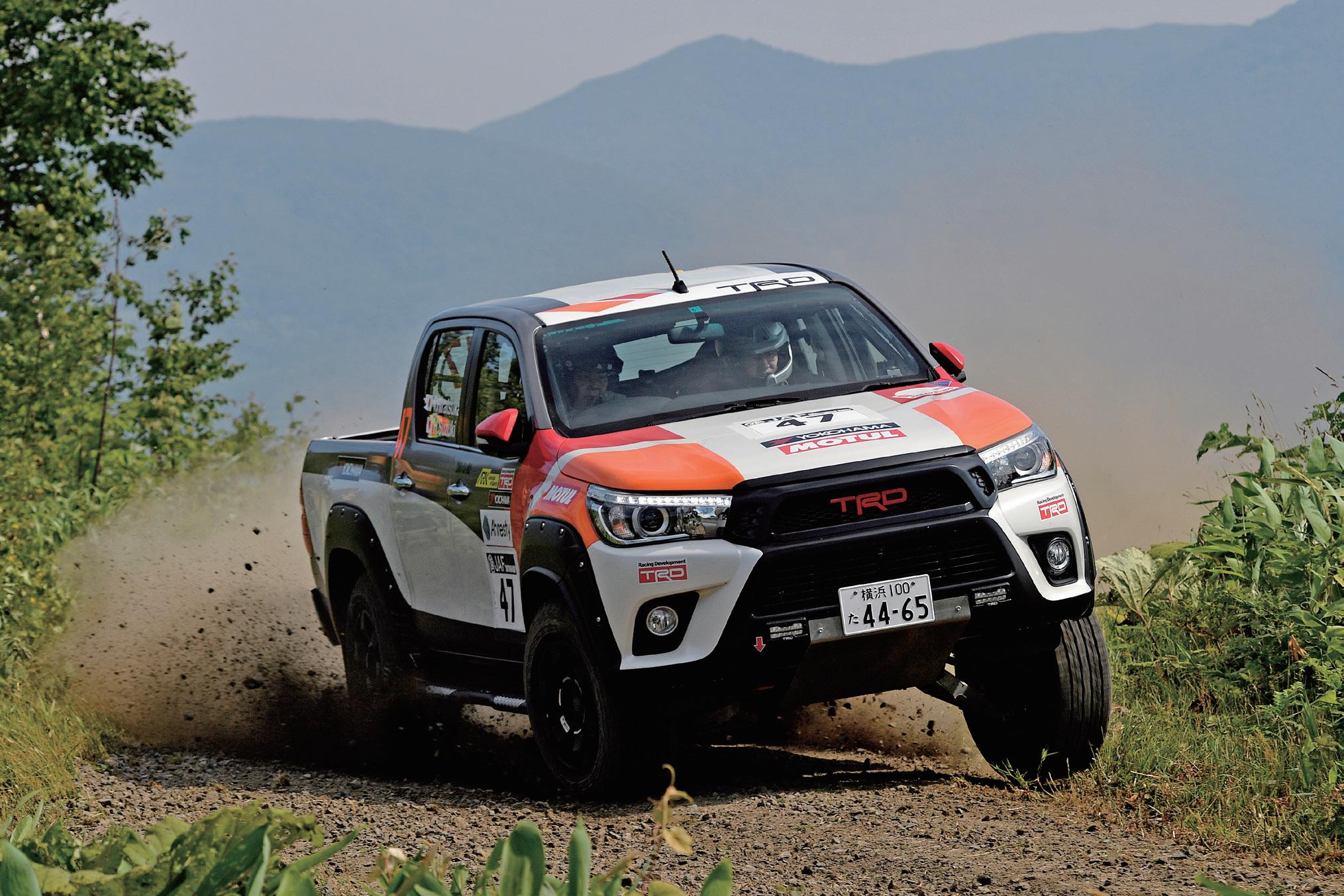 SUVで国内ラリー&ダートトライアル “適した車種”で楽しむダート走行とは!? ロスカントリーラリー、いわゆ るラリーレイドで活躍する競技 ベース車両が、全日本ラリー選 手権や全日本ダートトライアル選手権を新 たなフィールドにするべく、今シーズンか ら試験的な参戦が始まっている。 全日本ラリー選手権では、グラベルラリ ーにおいて「オープンXC(OP-XC)クラ ス」が新設され、第7戦 ラリー・カムイと第9戦 ラリー北海道ではハイラ ックスが参戦。また、全 日本ダートトライアル選 手権では、クローズドク ラス、そして第7戦今庄 ではJD1クラスにハイ ラックスが参戦し、今年 のグラベル系全日本イベ ントで、ピックアップト ラックが快走することに なった。 この新たな試みに関わ っているのが、全日本ラリーストにして全 日本ダートトライアラーの平塚忠博選手。 TRDの協力を得て、国内のBライ系グラ ベル競技におけるハイラックスの可能性を 検証している。 「ダートを走れる競技ベース車が減ってき たと言われてますが、その一方で、SUV車 は豊富にラインアップされています。SUV 用のマッドタイヤもあるわけだから、そう いったクルマが走れると面白いかな、とい うことを数年前から思っていました。 そんな時に、エビスサーキットで試験的 に開催されたラリークロスにハイラックス で参戦する機会があって、その流れで『ハ イラックスを有効活用できないか』という 話が出て、それなら国内競技をやってみよ ク Trial RALLY/ DIRT TRIAL 全日本ラリー選手権と全日本ダート トライアル選手権で、これまで多くの タイトルを獲得してきた平塚忠博選 手。今季はハイラックスで両シリーズ にスポット参戦している。 全日本ダートトライアル選手権/ 全日本ラリー選手権 平塚忠博選手 意外と奥が深い 20