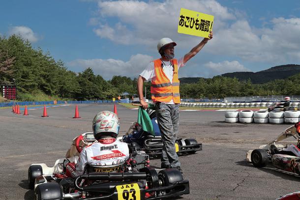 ターポストでコース全体を見ながら、トラ フェスティカサーキット瑞浪の運営を始め、ROTAXの輸入代理等の事業も 行う株式会社栄光の松堂栄誠氏は、今回の競技会開催役員の大会会長を務 める。「瑞浪の競技役員は前日入りして、選手たちの練習走行からしっかり 見て、当日はオフィシャルミーティングでこれらの情報を全員で共有し、大 会の詳細な段取りを決めていくんです」と、オフィシャル業務に取り組むモ チベーションの高さと責任感の強さが、大会を成功に導くカギと説く。