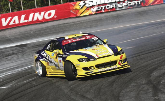 製品のエアロパーツはもちろん、サスペンションアー ムやナックルなど、機能パーツも市販品そのまま。し かもこれらはリーズナブルなプライス。中には自動車 メーカーが生産中止にしたパーツのリプロダクト品も 含まれ、それらの強度耐久テストの場としてもドリフ ト活動は活かされている。結果、多くのシルビアユー ザーが参考にし、救われていることだろう。 対する中村選手の参戦スタイルはとことん自己のア ピールに徹する。ボディカラーは自分の好みでレース マシンにはあまり存在しないツートーングラデーショ ンのラメ塗装。スタート前でも目立つために、敢えて アンチラグを空ぶかし重視で効かせていたり、その存 在感は悪役レスラーのようだ。中村選手いわく「ドリ