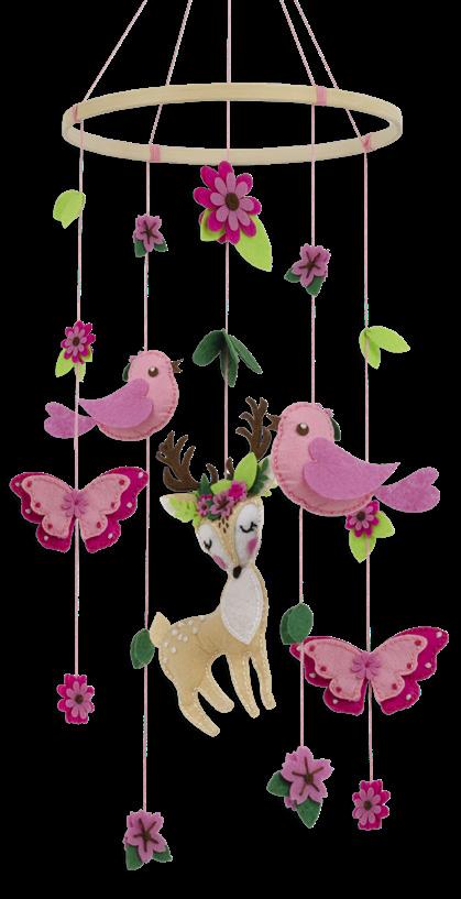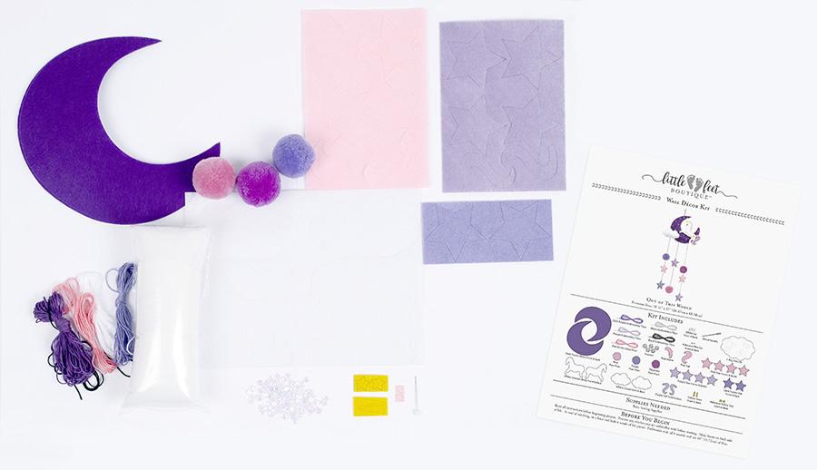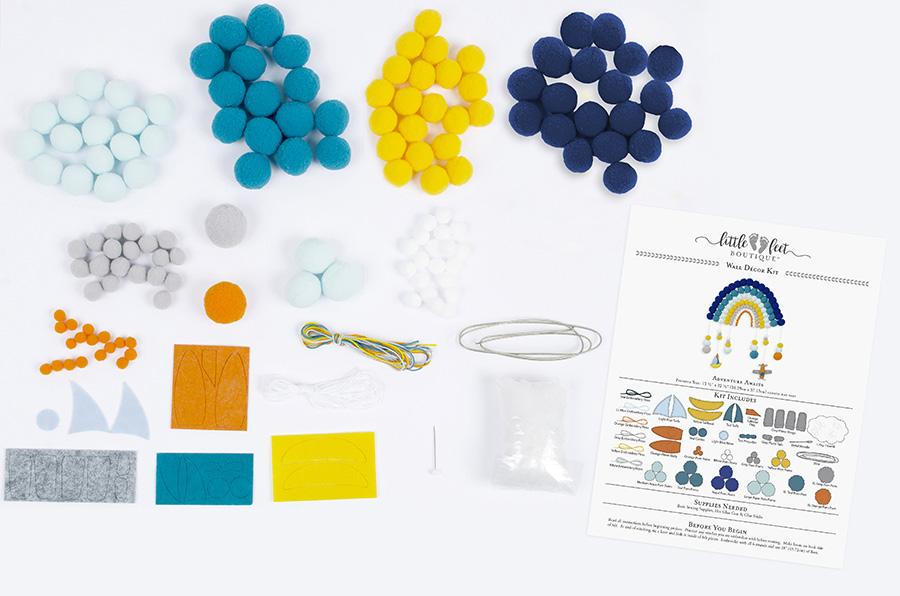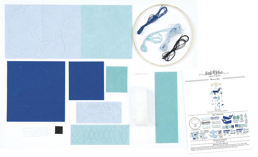 Each kit includes pre-punched felt pieces, adhesive felt pieces, bamboo hoop, metal needle, coordinating embroidery floss, lightweight polyester fiberfill and an easy-to-follow instruction sheet.