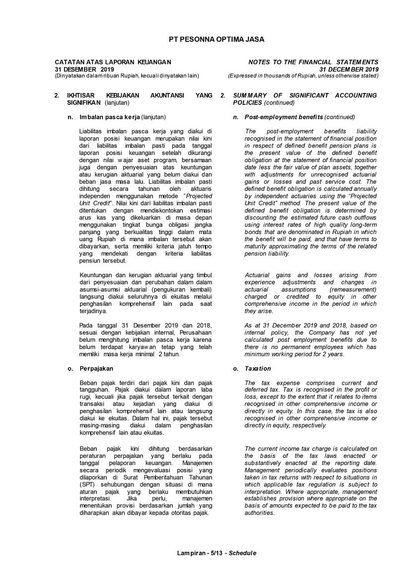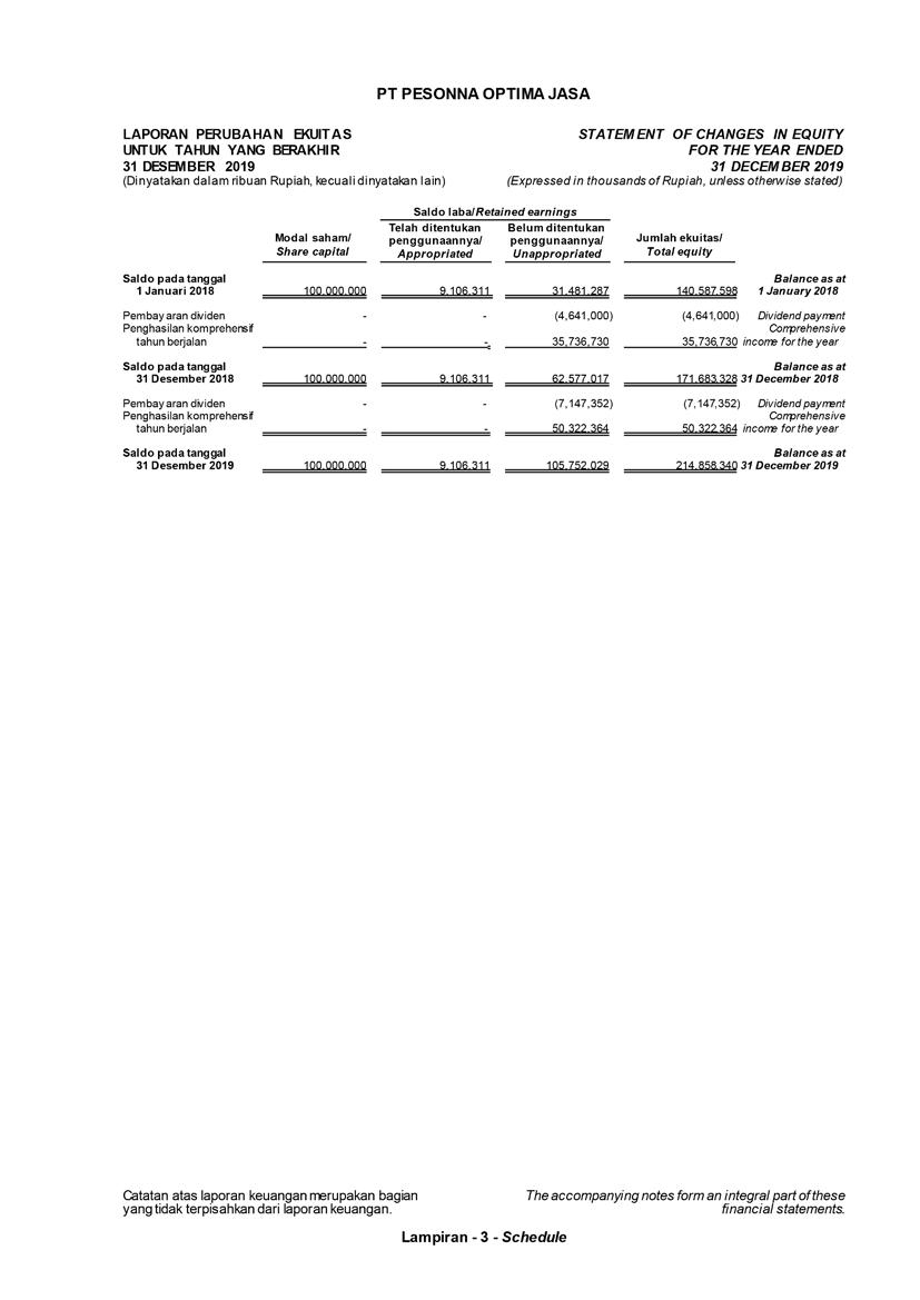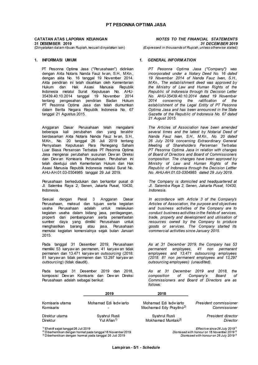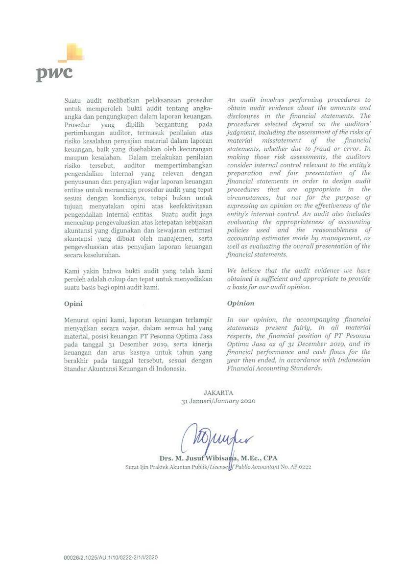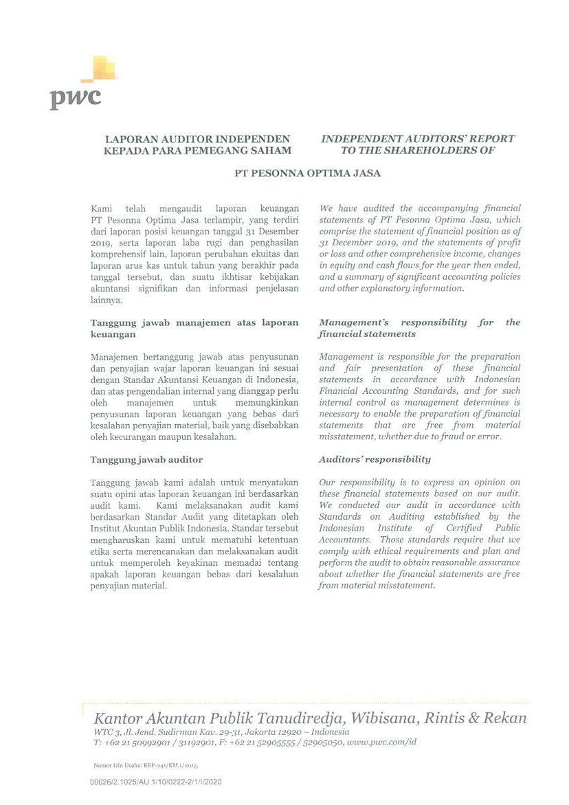 PT Pesonna Optima Jasa atau juga disebut “Perusahaan”, menyajikan Laporan Tahunan yang berakhir pada tanggal 31 Desember 2019 yang memuat informasi kinerja keuangan dan hasil usaha berdasarkan hasil audit Laporan Keuangan Kantor Akuntan Publik. Laporan tahunan ini juga memuat informasi-informasi yang mengandung proyeksi, rencana, strategi, dan tujuan yang bukan merupakan pernyataan data historis yang pada umumnya menggunakan kata seperti “percaya”, “mengharapkan”, “mengantisipasi”, “memperkirakan”, “memproyeksikan” atau kata-kata serupa lainnya, dan dapat dikategorikan sebagai pernyataan yang dapat bersifat pandangan ke depan (forward looking statement) sesuai definisi pada ketentuan yang berlaku.