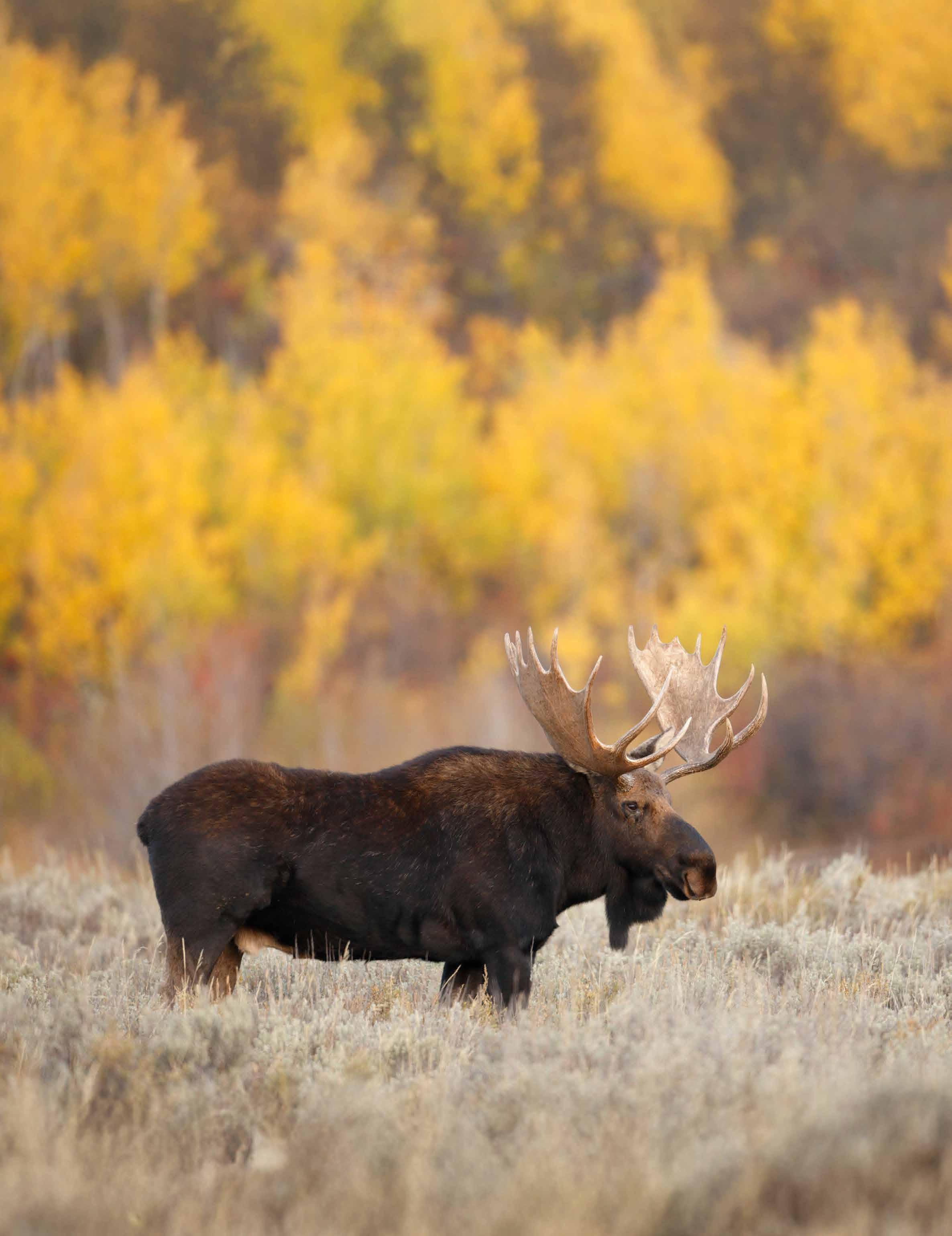 zum Spotten. Gunilla und Per-Mikael entdecken einen jungen Elchbullen und Per-Mikael sagt zu mir: „This is perfect moose for you, we try get him.“ Das letzte Wort ist kaum ausgesprochen, da geht es schon wieder in Sieben-Meilen-Schritten den Berg runter. Wir machen immer wieder halt, um den Elch zu rufen. Dann funkt Gunilla uns an, dass der junge Bulle in unsere Richtung unterwegs sei. Wir gehen hinter ein paar Wacholdersträuchern in Deckung. Per-Mikael ist ca. 30 Meter von mir entfernt und macht seine Elchrufe. Es dauert ein paar Minuten, dann sehe ich den jungen Elchbullen aus einer Dickung 200 Meter entfernt spitz auf mich zukommen. Ich versuche, mich hinter dem kleinen Wacholderstrauch so unsichtbar wie möglich zu machen. Der Elchbulle steht nun 5 Meter vor mir und äugt in meine Richtung. Ich halte die Luft an – ich kann so un-