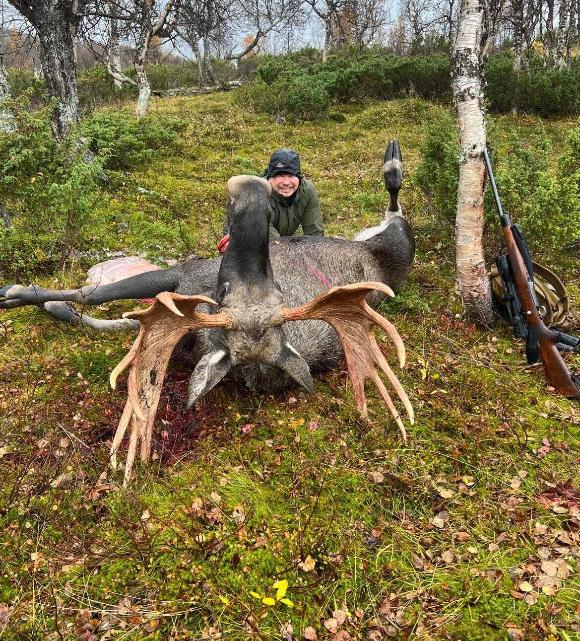Hütte zurückgeht. Hier teilen wir uns erneut auf, Per-Mikael und ich gehen Richtung Norden und die anderen Richtung Westen. Mein Begleiter hat wieder ein Tempo drauf, dass ich Mühe habe, in dem unwegsamen Gelände Schritt zu halten. Das Ganze geht ungefähr zwei Stunden so, als Per-Mikael mich wie aus dem Nichts anschreit: „Shoot, shoot, shoot!“ Da ich die ganze Zeit auf meine Füße geschaut habe, um nicht auszurutschen oder zu stolpern, habe ich bisher nicht mitbekommen, worum es geht, aber circa 150 Meter vor uns steht eine Elchkuh. Per-Mikael hat keine Geduld und trägt lieber selbst den Schuss an, die Elchkuh liegt im Knall. Mein Adrenalinlevel ist jetzt ganz oben und meine Hände zittern. Per-Mikael signalisiert mir, dass wir keine Zeit haben und unsere Beute schnell versorgen müssen. Zusammen wuchten wir die Kuh auf den Rücken und während ich sie an den Vorderläufen stabil halte, bricht mein Jagdführer sie auf. Man sieht, dass er das anscheinend täglich macht: Es dauert nicht viel länger als bei einem Reh und die Kuh ist fachgerecht aufgebrochen und versorgt. Zu meiner Verwunderung werden die Innereien anscheinend nicht verwertet. Wir spannen noch ein Netz über das Tier, welches Per-Mikael aus seinem Rucksack zaubert – das soll Beutegreifer davon abhalten, sich hier gütlich zu tun. Denn die Kuh muss über Nacht hier liegen bleiben, bis der Heli sie morgen abholen kann – heute ist es dafür schon zu spät. Per-Mikael und ich machen uns wieder auf den Weg und versuchen, noch ein bisschen mehr Beute zu machen – ohne Erfolg allerdings, in der Dämmerung kehren wir schließlich zur Hütte zurück. Die anderen sind auch schon da, sie hatten leider kein Glück. Es wird wieder ein lustiger Abend, alles scheint schon so vertraut, als würden wir uns seit Jahren kennen. Jagd verbindet eben. Das Vorgehen für den nächsten Tag fühlt sich ebenfalls schon wie Routine an: 4 Uhr aufstehen, fertig machen, Brote schmieren und rauf auf den Gipfel