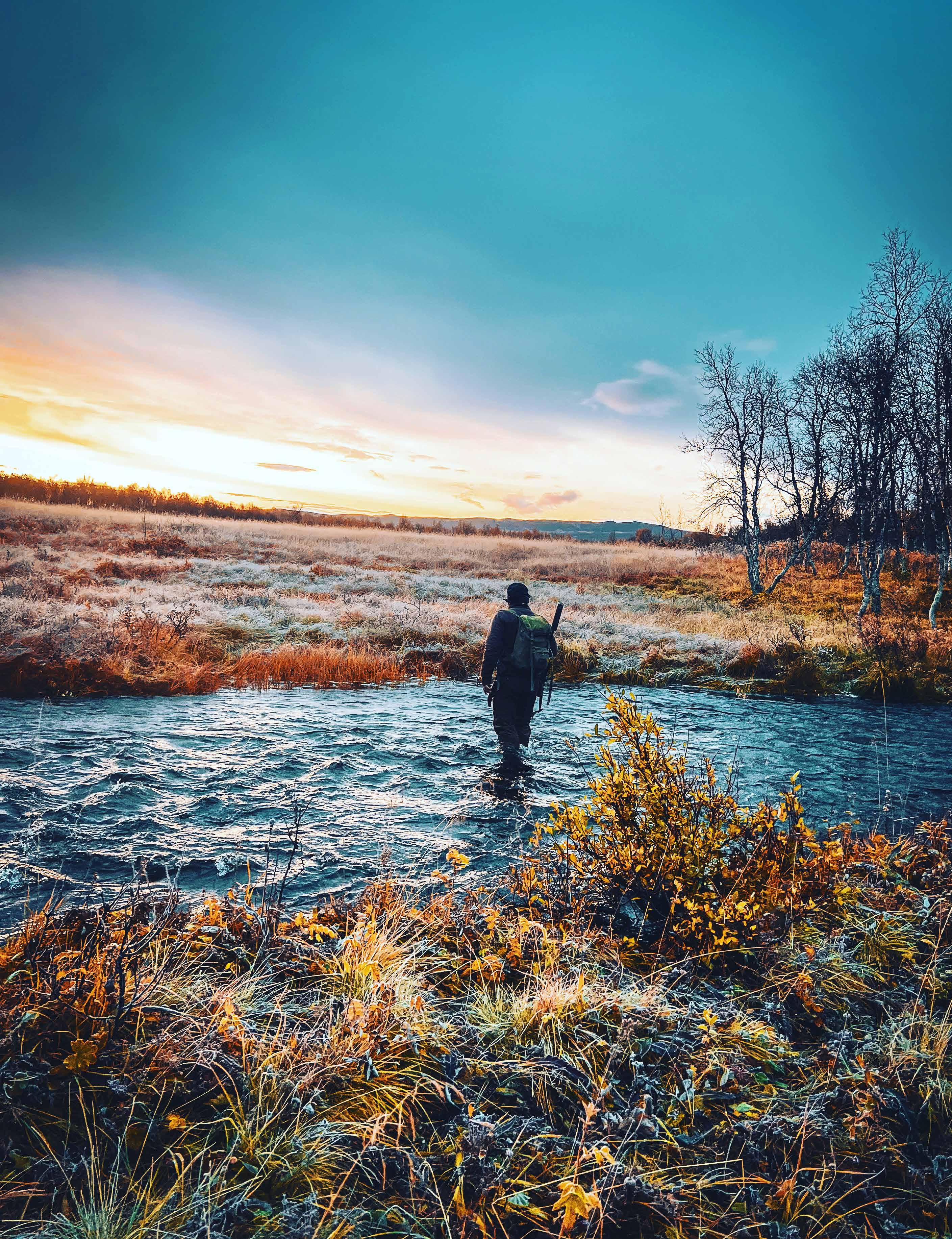 Wir schmieren uns schnell ein paar Brote und dann geht es schon wieder los. Unsere Klamotten sind zum Glück über Nacht getrocknet und einigermaßen warm. Dann folgt das gleiche Vorgehen wie gestern: Zuerst steigen wir auf den Hügel und halten gemeinsam Ausschau, die Sonne geht am Horizont auf und man kann schon ein bisschen was erkennen. Wir sehen eine Gruppe Elche nördlich von uns. Sofort gibt mir Per-Mikael das Signal zum Folgen. Wieder geht es in GewaltmarschManier den Berg hinunter, durch Dickungen, Flüsse und sumpfiges Terrain. Plötzlich ruft Per-Mikael: „Stopp!“ Ich bin natürlich sofort hellwach und erwarte, einen Elch in den Anblick zu bekommen.