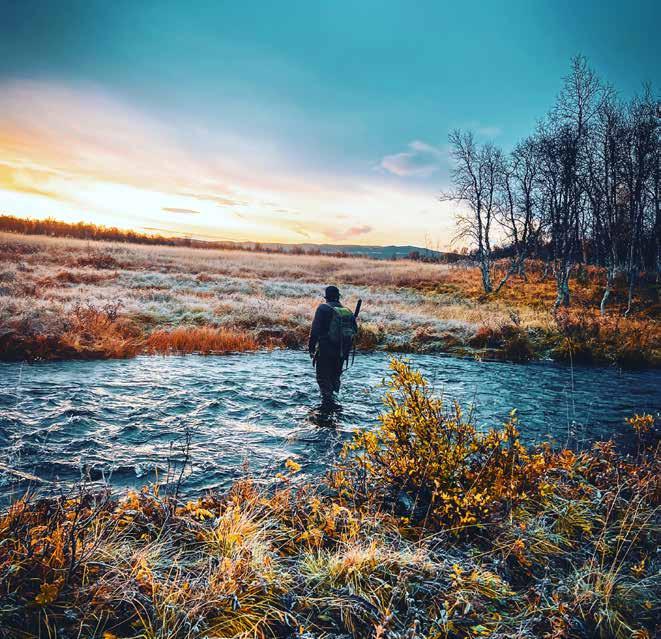 in Windeseile zwei Boote zu Wasser lassen und schon sitze ich mit Per-Mikael und seinem Hund in einem davon und wir fahren quer über den See, Jesper ist mit den anderen in die entgegengesetzte Richtung unterwegs. Als wir nach 30 Minuten Fahrt auf der anderen Seite ankommen, macht PerMikael mir klar, dass er hier noch gestern mehrere Bullen und Elchkühe gesehen hat. Wir wandern circa 30 Minuten zu einem vielversprechenden Spot und sogleich fängt mein Jagdführer an, die Bullen zu rufen. Das machen wir auch noch an drei weiteren Spots, bis Per-Mikael sagt: „We make sleep now.“ Wir legen uns ins nasse Moos und pennen erstmal für ein Stündchen – ich wundere mich über gar nichts mehr und bin ehrlicherweise sogar dankbar, dass wir mal eine Pause machen. Das Moos erweist sich, trotz Nässe, als angenehme Schlafunterlage und ich schaffe es sogar, für circa 40 Minuten zu schlafen. Als ich aufwache, schnarcht mein Begleiter noch neben mir, aber auch er erwacht einige Minuten später. Weiter geht’s, leider ohne Anblick. Als wir merken, dass es dämmert, meint Per-Mikael, dass wir uns beeilen müssen und ich merke, was er damit meint: Als wir das Boot erreichen, ist es schon ziemlich dunkel und wir haben keine Beleuchtung an Bord. Ich weiß nicht, wie er es macht, aber wir fahren im Stockdunkeln über den See und ich habe zu keinem Zeitpunkt einen Schimmer, wo wir sind oder in welche Richtung wir fahren. Irgendwann taucht ein kleines Licht am Ufer auf, das Bootshaus. Wir kommen noch vor den anderen an und müssen warten. Per-Mikael nutzt die Zeit, um mir mit Händen und Füßen und ein bisschen gebrochenem Englisch mehr über die Jagd und das Leben der Samen hier zu erzählen. Ich habe ja schon gemerkt, dass er sich hervorragend auskennt und ziemlich im Einklang mit der Natur lebt. Ich frage ihn, ob er die Elche, die er und seine Familie erbeuten, selber verwertet und sich davon ernährt. Er verneint und erzählt, dass Rentierfleisch eine wahre Delikatesse sei. Die Elche bringen gutes Geld, sie werden direkt mit dem Heli ins Tal ge-