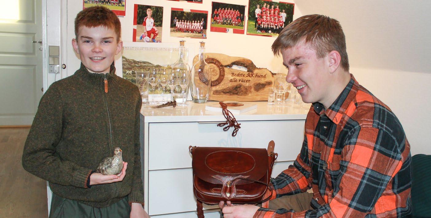 På værelset ved siden af står der endnu flere præmier og pokaler, så Mads har no get at se op til. Her har storebror Mathias nemlig linet alle sine præmier op. Det var Mathias, der vandt DGSK 100-års jubi læumsprøve, så der er fyldt godt op hos ham. Brødrene viser stolte alle deres præ mier frem, men de bliver nok aldrig enige om, hvem der fik den bedste præmie med hjem fra DGSK 100-års jubilæum: Mads er fuldstændig sikker på, at hans agerhøne er det absolut bedste, man overhovedet kunne vinde, og Mathias er modsat ret stolt af alle sine præmier, særligt den flotte unikke lædertaske, som han vandt med sin engelske setter Sally.