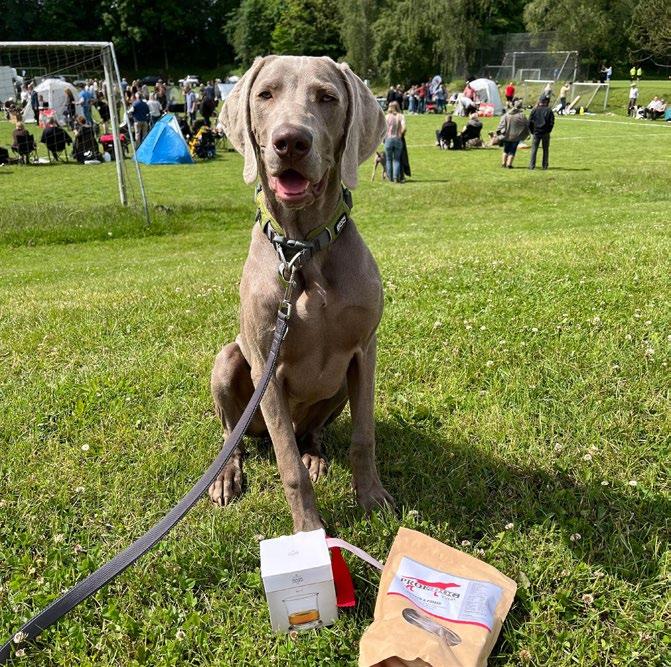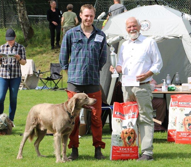 2 gange i løbet af dagen var der fremvis ning i ringen i midten af udstillingsområ det, hvor alle repræsenterede racer blev vist frem, mens en konferencier fortalte om den enkelte races kendetegn. Efter præsentationen kunne man vælge at deltage i en opvisning i apportering, og – indrømmet – tanken strejfede mig, at det måske ville være svært at hamle op med retrievere og kontinentale racer, når man er så uerfaren en hundefører som jeg, men vi kastede os ud i det alligevel, og så måtte vi tage det som en oplevelse og en mulighed for at træne under andre