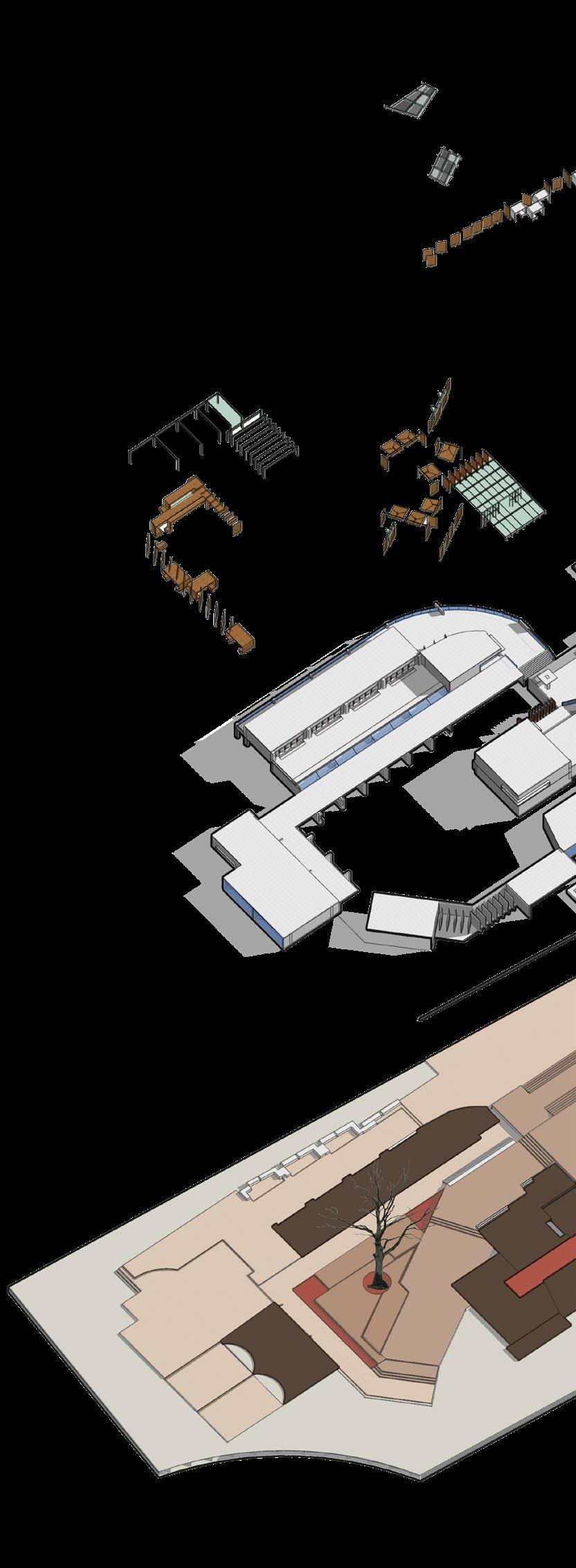 The grid wall is used in the plaza and the arrangement of pods gives it a character of a pixel wall which is in contrast with other solid surfaces