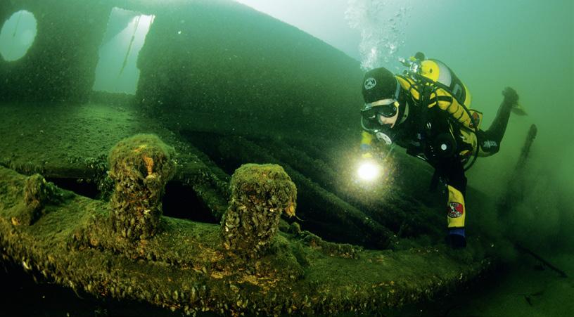 variety despite changing visibility. Carp, perch, pike and catfish live in the water. Underwater attractions include the wrecks of the two-masted barque "Hein Mück" and the cabin motorboat "Christel II", a sunken telephone box, remains of mine cars and a diving bell. In the darker depths, it almost feels like a deep dive – a lamp and compass are essential.