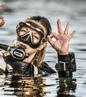 To capture the diver's face and eyes, the camera should be positioned horizontally and at the diver's eye level. Avoid shooting from below.