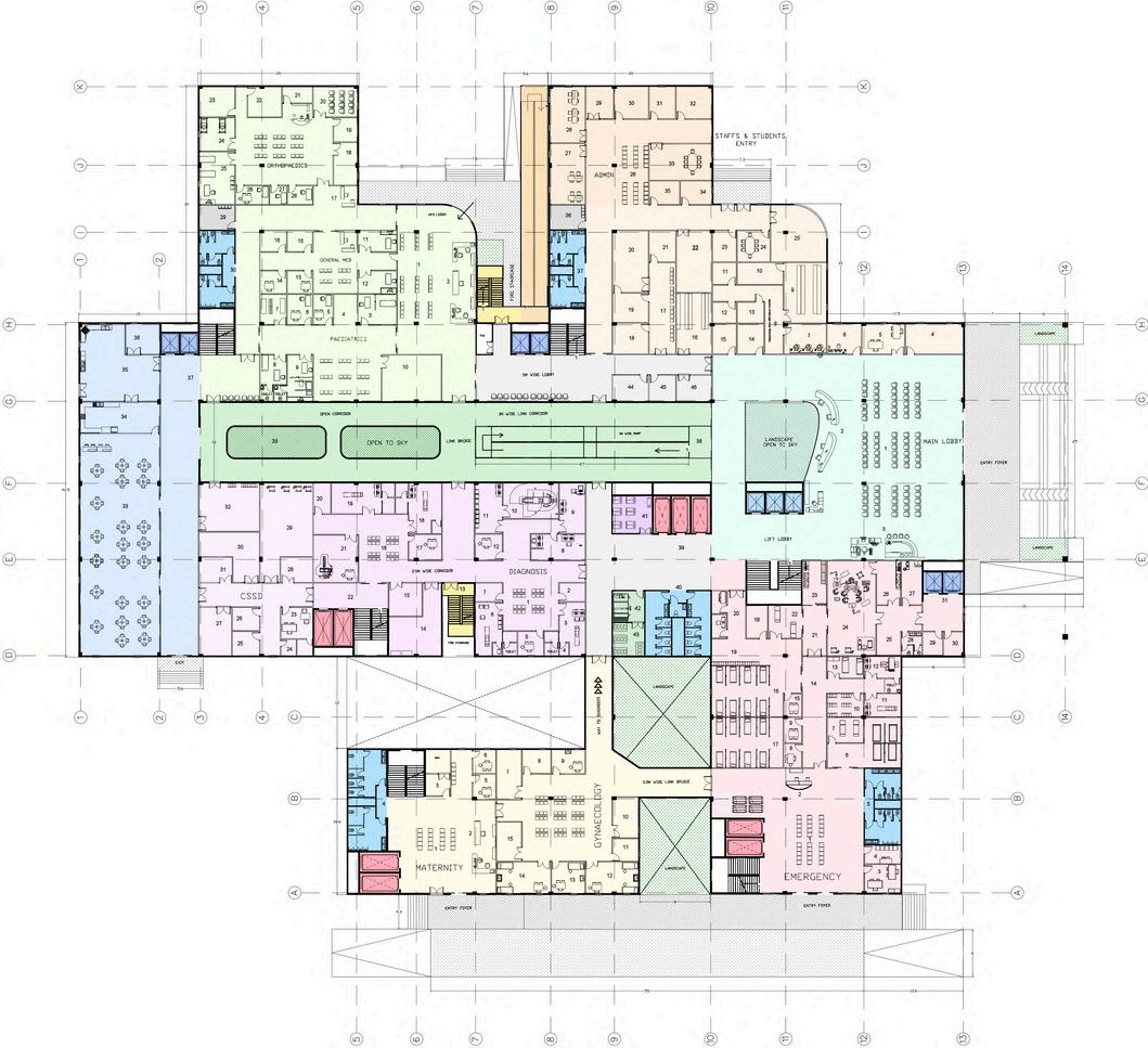 The challenge was to design a 650 bed multispecialty hospital in the given site at pondicherry. The area of the given site was 15.5 acres, facing east It had a canal running at the west, which gave the site a better view potential.