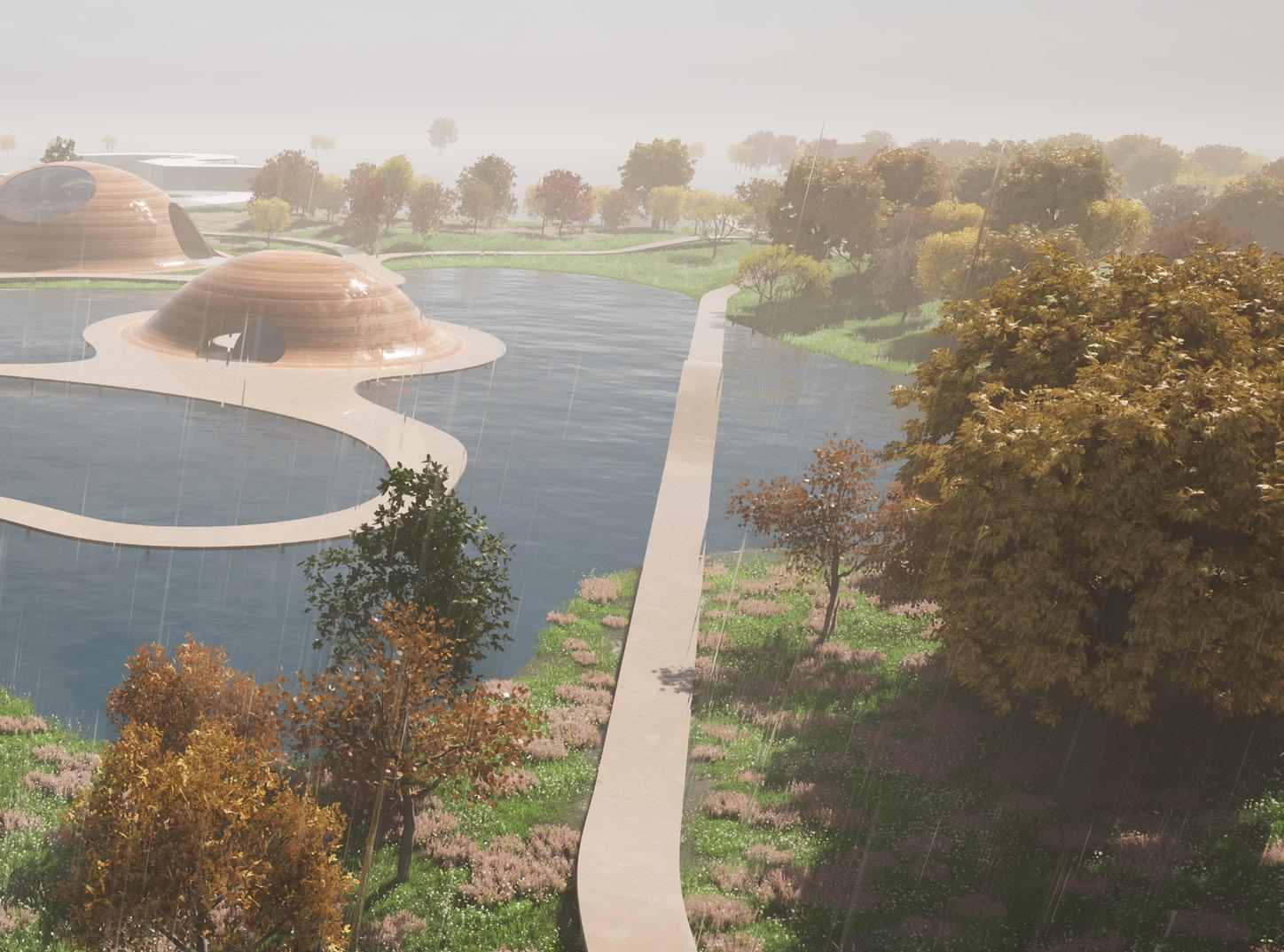 Prøvestenen Syd is an abandoned landfill site in Copenhagen Denmark. It is an unfamiliar territory with jagged lines and manmade structures. By introducing familiar and systematic shapes, familiarity is brought back into this space. At the same time, this landscape of small hills and round buildings force exploration by creating multiple path and winding spaces.