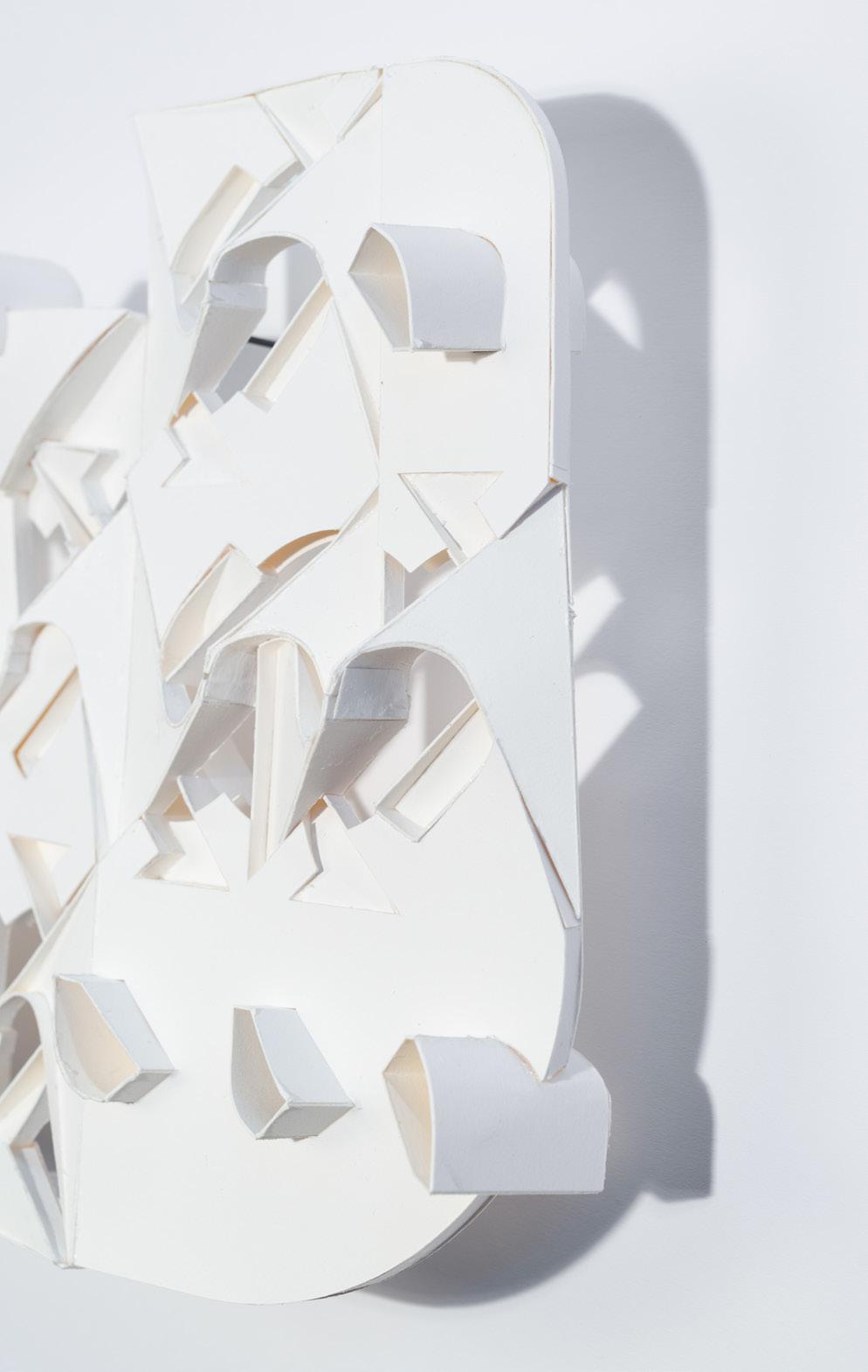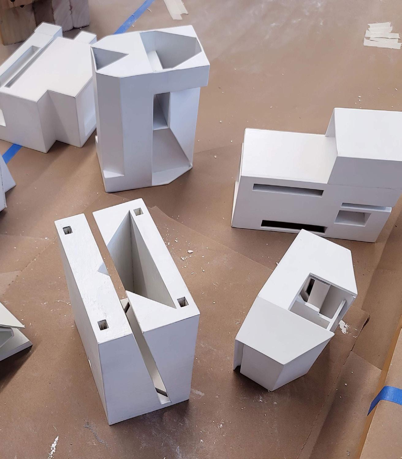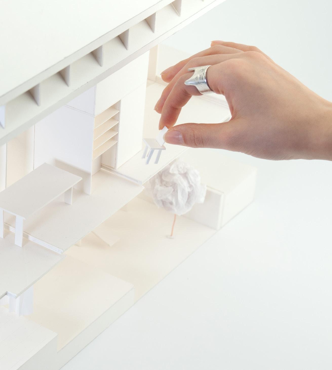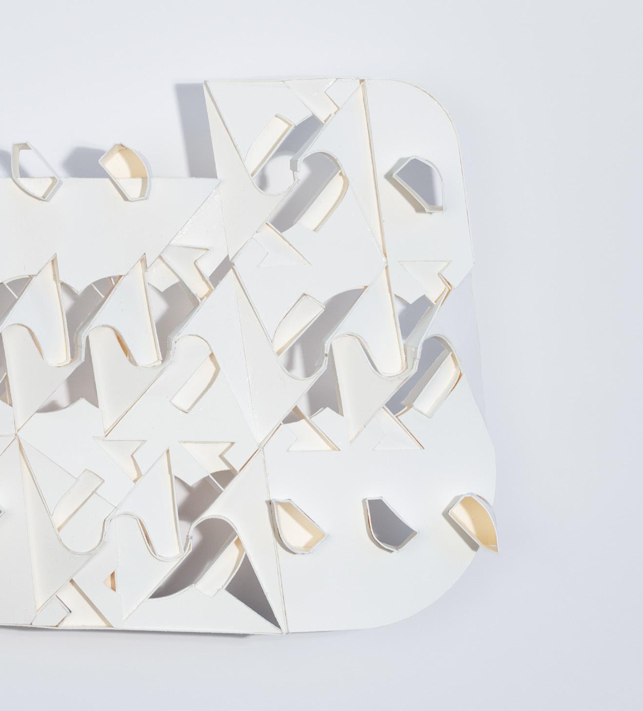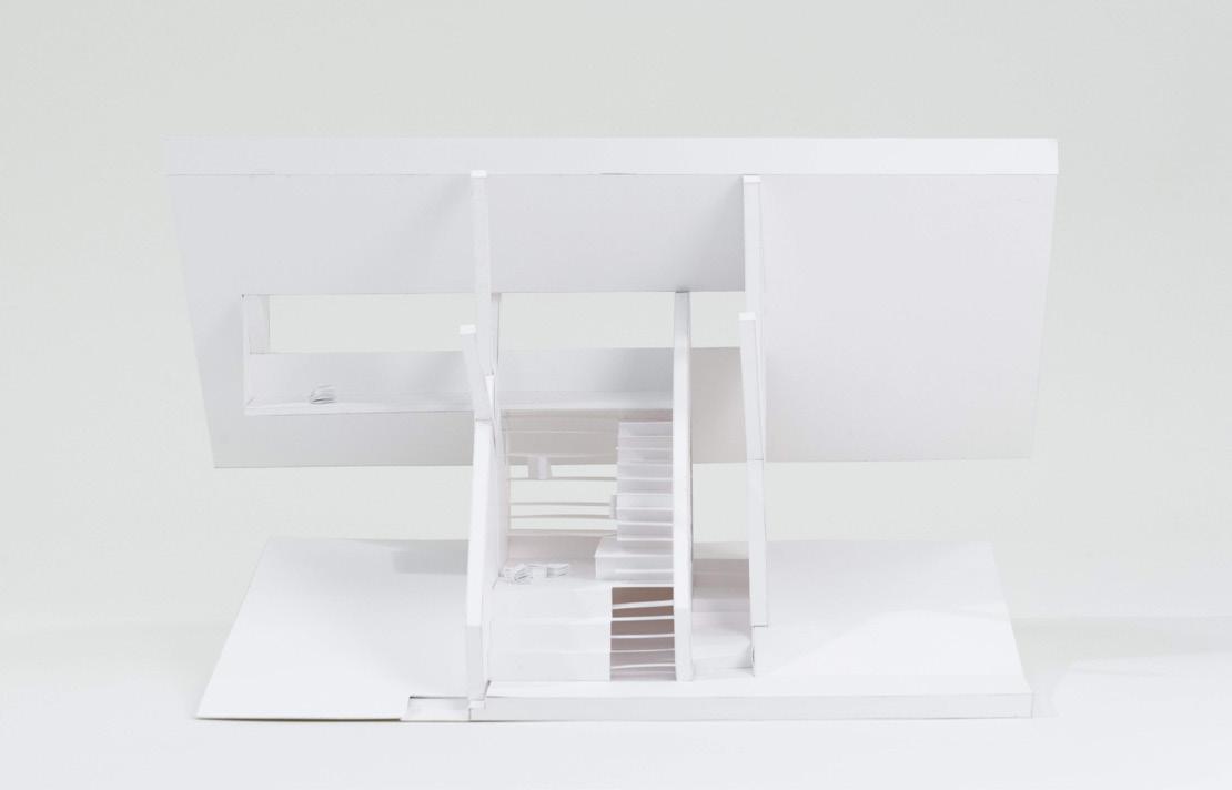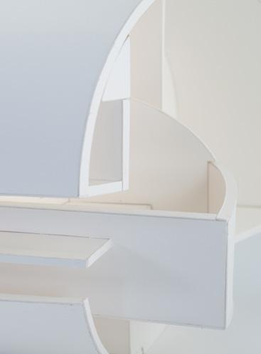 The model can be read as one open space. Depending on where it is, volumes can be read differently due to condensing and expanding shells. The inside and outside are pushed and pulled out of its bounds. This create moments where space slips out, cuts through and almost touches the shell.