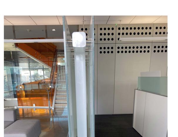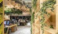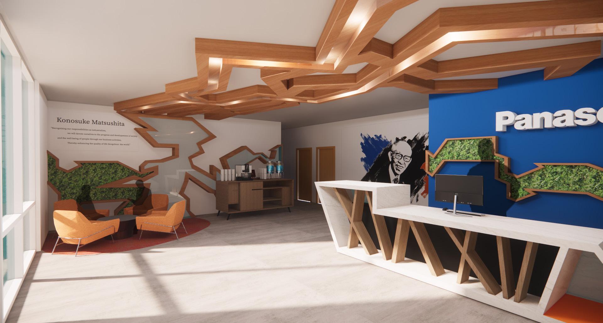 The Feature wall includes an organic shape derived from testing out different lines. The biophilic element connects clients and employees to nature and sparks Panasonic’s move towards green energy.