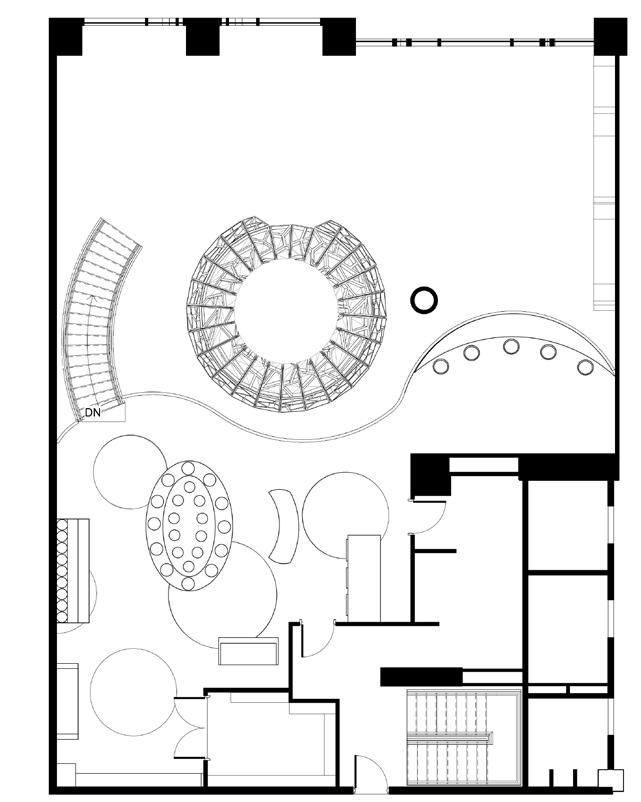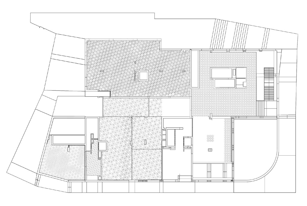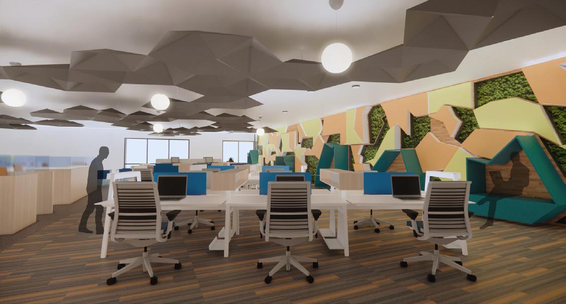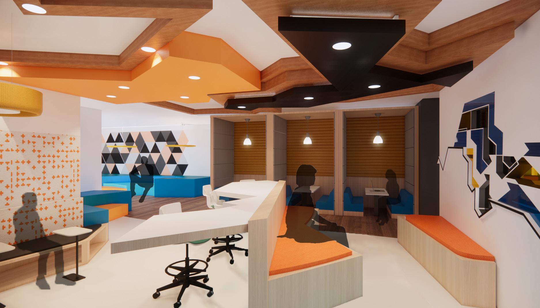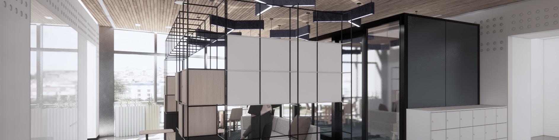The ceiling grid is derived from a puzzle study that plays with the removal of pieces to provide relief and discover depth for a more intimate and active environment.