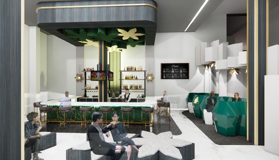 The Cafe/ Bar and Night Lounge is a great social setting for people to interact and take in the beautiful structural designs of District S. The design for this space was derived from the 2D flower pattern that branched out to become the step system, ceiling pieces, and the pods in this space. The steps were designed in a way to be interactive and allow people to climb up and mingle with friends. We also filled in the spaces where the pattern meets with a lightly blue tinted resin that appears to glisten when the natural sunlight hits it.