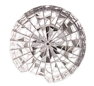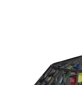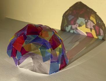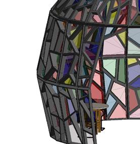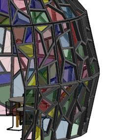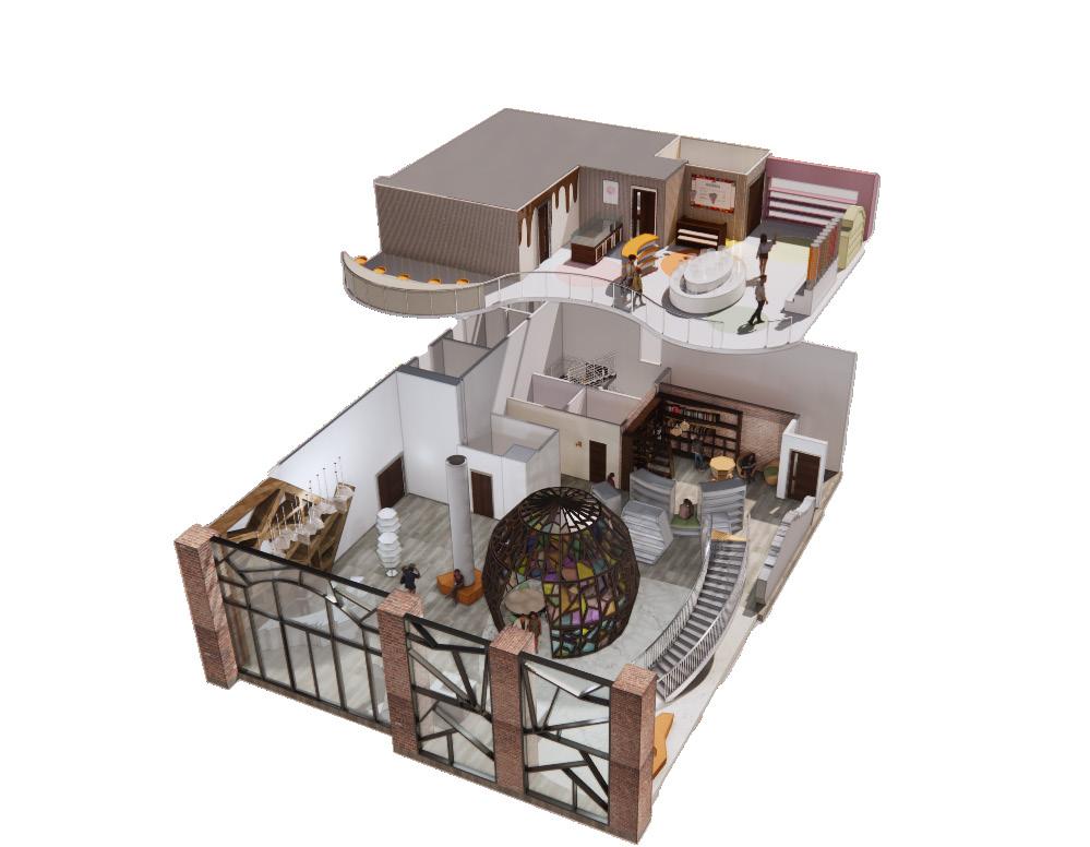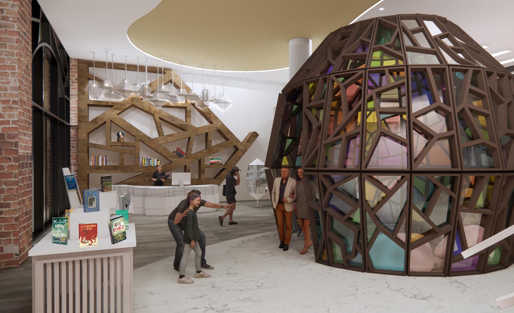 The First Friday Reading Area is a place where people can explore crafts and new books with authors. The dome is inspired by candy. It has a hard outer shell that acts as a shelter with crystallized stain glass for customer visibility.