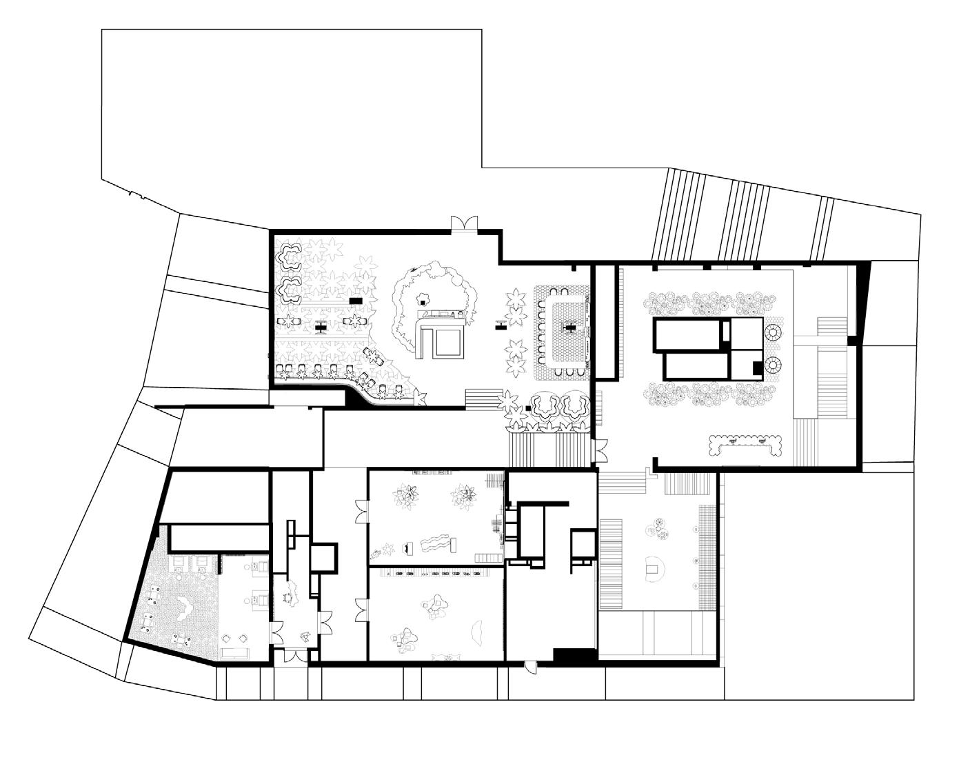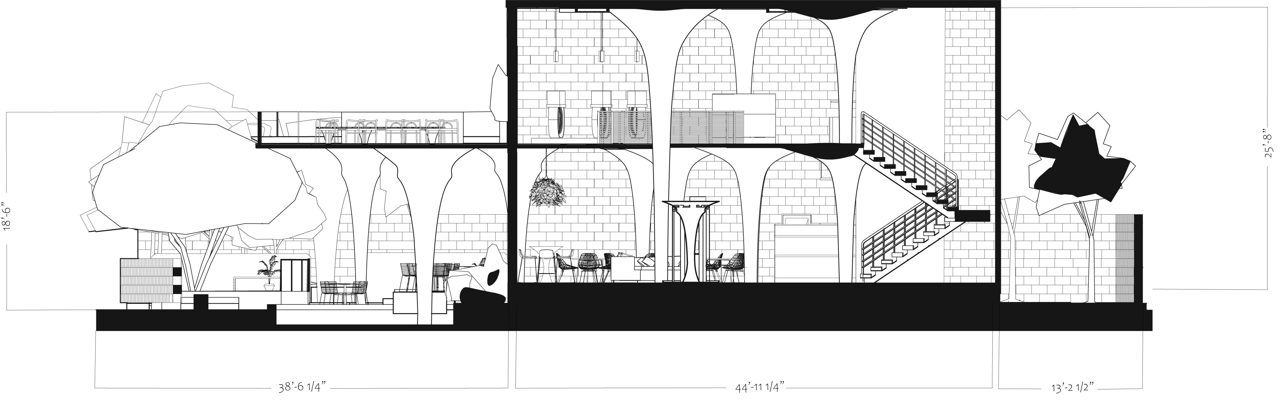 The second floor houses the art exhibition and live music on the terrace. The opening through the two levels in the center helps encourage spatial organization while utilizing natural light to help brighten the space and connect to the outdoors.