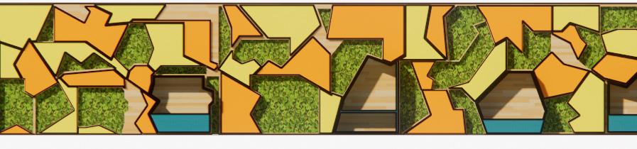 This wall was created for the sales department. It plays with the concept of puzzle pieces coming together to form a whole. I designed built-in seating spaces for people to work individually. This wall feature has biophilia elements to tie the space back to nature and green energy.