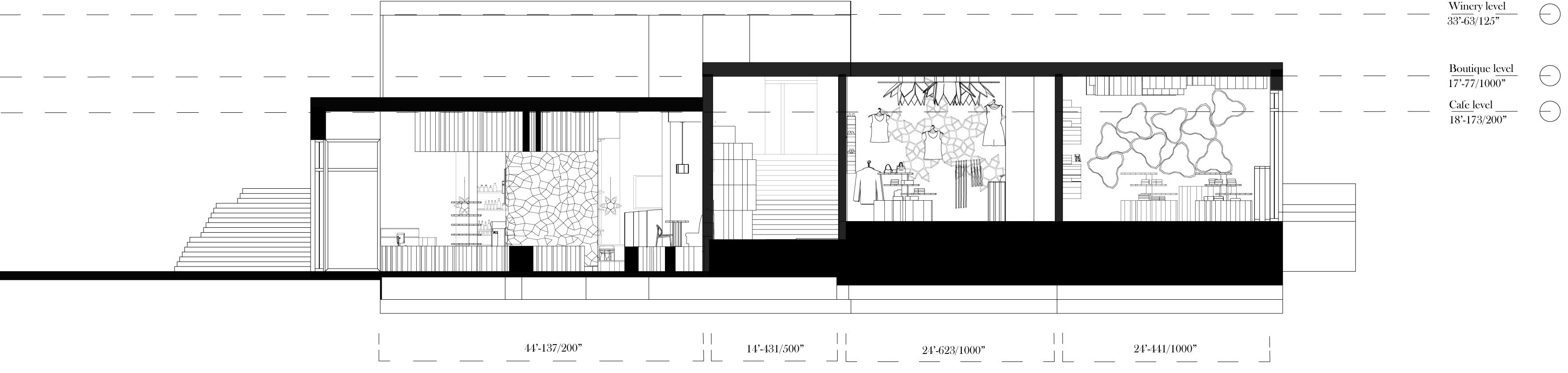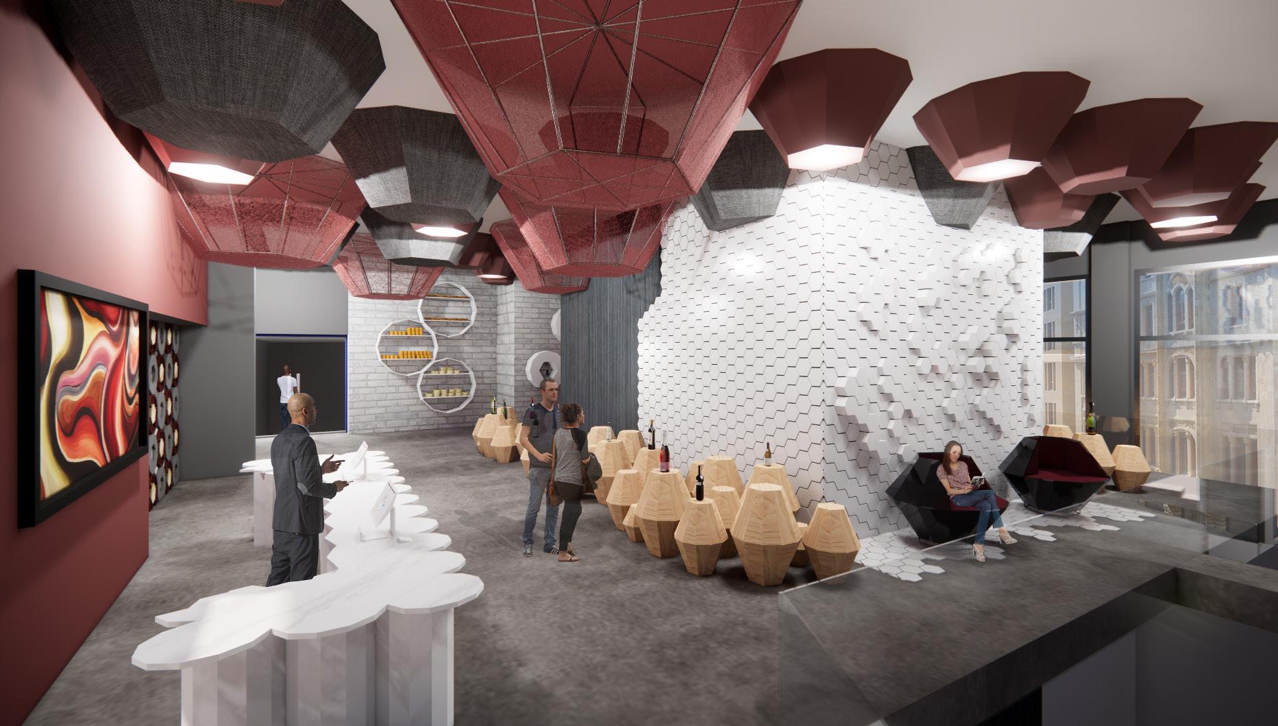 In the Winery, the focal point is the giant ceiling pieces that engulfs the space. These pieces are derived from a 2D Pattern that is also used to create the wine display barrels underneath. The ceiling also has pieces that glow and act as a light source to illuminate the space. In the winery, there are deeper colors of burgundy and grays to set an intimate and cozier feel to the space.