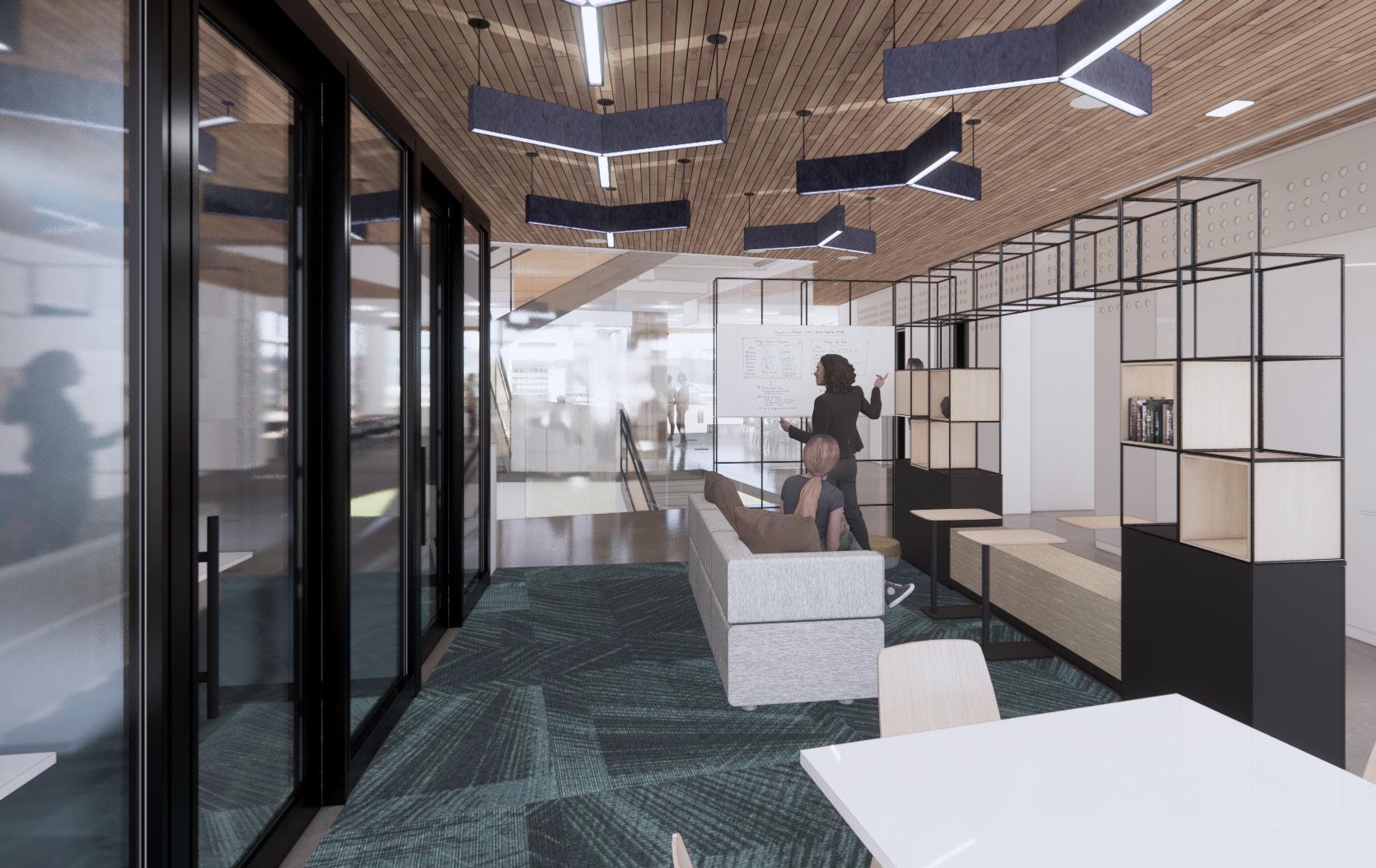 The Entrepreneurship Center is in the middle of the floor plate located on the second floor which connects to labs and office spaces. The client challenged us to create a more visually stimulating space that could support functional collaboration for the users and reduce clutter. This new design offers a dynamic approach, allowing for more flexible and diverse uses in the center. In the workspace, there are now three offices, a coffee counter with a sliding barn door, and a variety of seating areas. The client was really happy with this approach because every space served a better purpose.