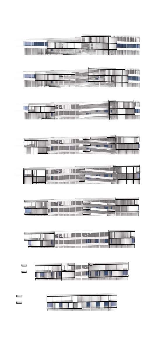 The project begins in the southeast and ascends through a continuous space that leads you through it. As you ascend the route, you pass through the different uses of the music school, which are configured around it. In this way, the entire path and space is in permanent contact with sound. When you reach the student residence, the path forks to distinguish public and private spaces. Once this section is crossed, the route leads to the roof of the building, where the configuration of the roof directs you either towards Casa de Campo, continuing the green axis proposed by the new footbridge over the M30; or towards the public square that is created in the interior.