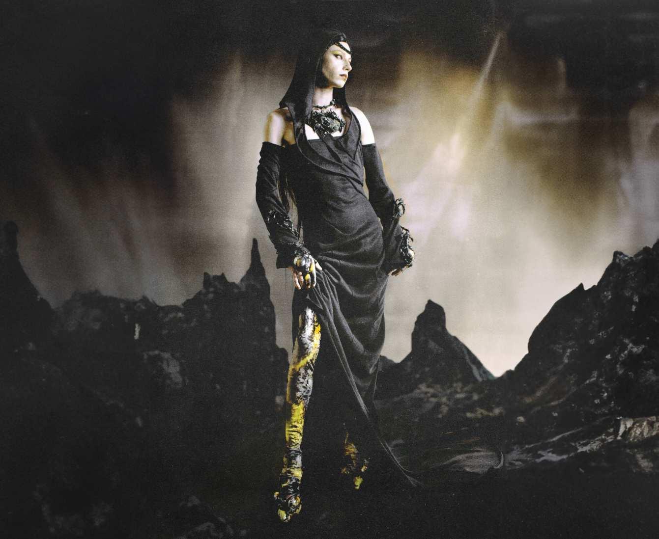 ouroboros dress/hood #003 lead and sulfur printed stockings/gloves/shoes #004 hermetic vessel braces