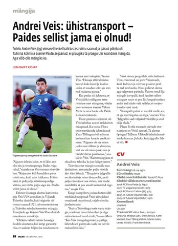 Andrei Veis: ühistransport – Paides sellist jama ei olnud! Poleks Andrei Veis (19) viimasel hetkel kahtlustest võitu saanud ja pärast põhikooli Tallinna kolimise asemel Paidesse jäänud, ei pruugiks ta praegu U21 koondises mängida. Aga võib-olla mängiks ka. Lennart Komp konna eest mängida,” lausus Veis. “Hooaja ettevalmistus kestab kaks kuud ja loodan siiski, et suudan selle aja sees end maksma panna.” Kui peaks nii juhtuma, et Veis jääbki esiliigasse teise rivistuse eest mängima, võtaks poisi esimene treener Viktor Mets ta oma hoole alla Paide Linnameeskonda. Enne pealinna kolimist oli Veis kaheksa aastat keskkaitses mänginud. Ka toona Flora teist meeskonda juhendanud Zaur Tšilingarašvili nihutas keskeestlase hoopis poolkaitsesse. “Alguses oli see minu jaoks suur üllatus ja ehmatus, sest see oli minu jaoks uus ja täiesti võõras positsioon,” analüüsis Veis. “Kaitsemängijana ei olnud mu tehnika ka just kõige parem.” Tuleviku eest mängis ta mullu taas äärekaitses, armastades palju mööda äärt üles liikuda. “Tänapäeva jalgpallis on äärekaitsja teine äärepoolik, peab palju rünnakust osa võtma, mis mulle meeldibki, ei pea ainult kaitsetööd tegema,” vaagis Veis. Kuigi noorpõlves jooksudistantsidel medaleid noppinud Veisi kiiruslikud omadused on priimad, vajab tehnika järeleaitamist. “Kui ta Tulevikuga meie vastu mängis, teadsime tema lahendusi ja väga mitmekesised need ei ole,” lausus Mets. “Kui Veis mängulugemise ja palliga lahendused paremaks saab, on tal võimalusi läbi lüüa.”