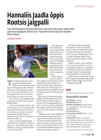 Enne Rootsi minekut olid Jaadlal omal nahal tundmata ka Keith Boanasi ja Peter McGoverni rasked treeningud, mistõttu kulus veel aasta varem kohalikus kõrgeimas seltskonnas pallinud Umeå Södra harjutuskordadega kohanemine oodatust vaevalisemaks. “Põhiprobleem oli selles, et Rootsi naiste jalgpall on hästi füüsiline, mõnes sisehalli trennis lihtsalt lükati vastu seina,” meenutab endine viljandlanna. “Seal oli iga päev treening nagu meil praegu koondises kord nädalas või isegi veel kõrgemal tasemel. Pidin ikka pingutama.” Kahes liiga- ja ühes karikamängus väljakule usaldatud Jaadla sõnul ei ole Rootsi esiliiga tase siiski midagi ületamatut. Oma koondisekaaslaste seas näeb ta mitut, kes võiksid seal läbi lüüa. Kuna palka makstakse vaid kõrgliigas, ei ole selle sammu tegemine just kõige lihtsam. “Muidugi tahaks uuesti välisklubisse!” süttivad Jaadla tumepruunid silmad rangete mustade prilliraamide tagant. “Kui Eesti mängijad kasvaksid samasuguses süsteemis nagu Rootsis, oleks meie tase palju kõrgem, kuid arvan, et ka praegused koondislased peaksid tugevamatesse liigadesse pürgima.” Foto: Lembit Peegel