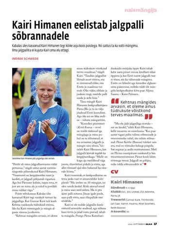 Kairi Himanen eelistab jalgpalli sõbrannadele Kabalas üles kasvanud Kairi Himanen tegi kõike asju koos poistega. Nii sattus ta ka vutti mängima. Ilma jalgpallita ei kujuta Kairi oma elu ettegi. Indrek Schwede ainus tüdrukute võistkond terves maailmas,” räägib Kairi. “Tundsin jalgpallist lihtsalt suurt rõõmu, ma ei süvenenud üldse, mis Eestis ja maailmas toimub. Olin väike, siblisin ja jooksin ringi, meeldis palli saada ja seda lüüa.” Täna mängib Kairi Himanen keskpoolkaitsjana Pärnu JKs ja ta on välja jõudnud Eesti koondisse. Aga üks asi on ikka endine – tohutu mängurõõm. “Koondise peatreener (Keith Boanas – toim) on eraldi rääkinud iga mängijaga ja minu puhul on ta rõhutanud, et ma armastan jalgpalli ja mängin sära silmis,” kõneleb Kairi Himanen, kes jalgpalli kõrvalt tegeleb ka kergejõustikuga. “Mulle on kogu aja meeldinud väga joosta, õhuvõitlusi pidada ja sööta, aga alles viimasel ajal olen hakanud ka väravale lööma.” Kairi tunnistab, et keskpoolkaitse on tema jaoks vaat et ainumõeldav koht platsil: “Mu ümber on 10 mängijat, ise olen nende keskel. Kõik aitavad mind ja mina saan neid aidata. Ma ei pea ääres palli ootama. Jõuan igale poole, saan palli võtta, saan õhupallide eest võidelda.” Kairi ei ole endale jalgpallis konkreetseid eesmärke seadnud, aga niikaua kuni tervis ja jalad vastu peavad, tahab ta mängida. Praegu Pärnu Kutsehari-