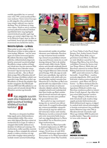 ise, Victor Valdes, Carles Puyol, Sergio Busqets, Xavi, Andres Iniesta, Gerard Pique, Pedro, Bojan Krkic ning argentiinlane Lionel Messi. La Masiast on tuule tiibadesse saanud ka Cesc Fabregas, Pepe Reina, Ivan de la Pena, mehhiklane Giovani dos Santos, itaallane Thiago Motta jt. Mullu käis end Barcelonas näitamas ka eestlane Herol Riiberg, keda kutsuti tänavuseks tagasi. 2009. aastal valiti esimene La Masia kasvandik – Lionel Messi – maailma parimaks jalgpalluriks. 2010. aastal olid kõik kolm maailma parima jalgpalluri nominenti – peale Messi veel Xavi ja Iniesta – La Masia vilistlased. Barcelona noorteakadeemia loodi 1979. aastal legendaarse Hollandi vutitähe ning Barcelona meeskonna palluri ja treeneri Johan Cruyffi algatusel. Aga sellest kõigest mõnes Jalka järgmises numbris. Praegu tõdegem, et Barcelonal on kõik võimalused saada maailma kõigi aegade parimaks klubimeeskonnaks. Klubi juhtkond peab tagama, et jalgpallis sisuliselt kõik võitnud juhtmängijad ei kaotaks motivatsiooni ning suudetaks kaitsta Meistrite Liiga võitu. Pele ja Maradona kõrvale tõusmiseks vajab Messi aga võidukat MM-finaalturniiri ja pikka karjääri. Väga palju eesseisvast on tema enda võimuses.