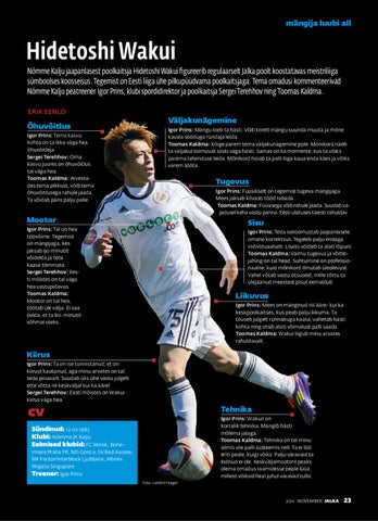 Hidetoshi Wakui Nõmme Kalju jaapanlasest poolkaitsja Hidetoshi Wakui figureerib regulaarselt Jalka poolt koostatavas meistriliiga sümboolses koosseisus. Tegemist on Eesti liiga ühe pilkupüüdvama poolkaitsjaga. Tema omadusi kommenteerivad Nõmme Kalju peatreener Igor Prins, klubi spordidirektor ja poolkaitsja Sergei Terehhov ning Toomas Kaldma. Erik Eenlo