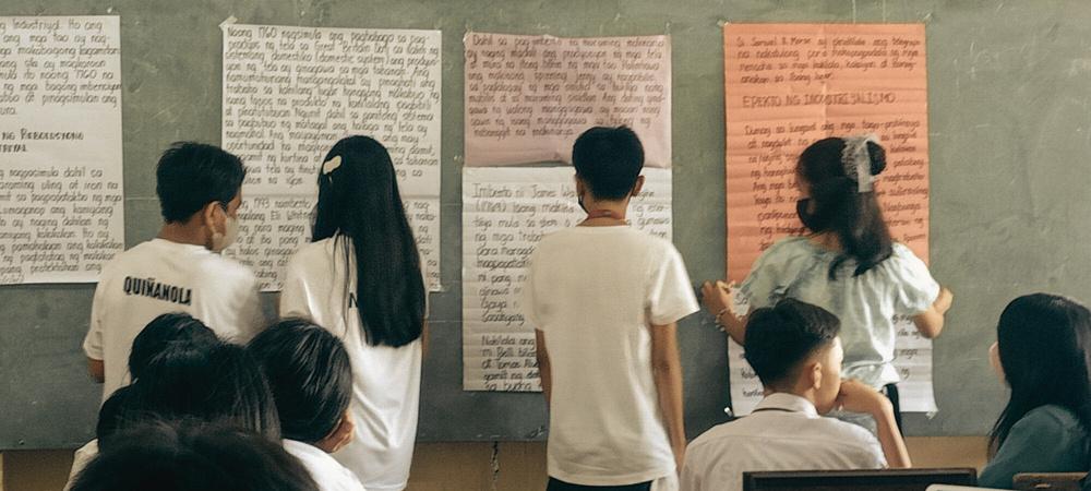 this Friday's Araling Panlipunan (AP) class, instead of administering the assessment, Mrs. Villegas continued the reporting activity. Group 3 was tasked to report on the Industrial Revolution. There was only one representative who reported. The student had a visual aid in the form of Manila papers full of text. But before the reporting, Mrs. Villegas did a recall of the previously reported topics to establish a connection.