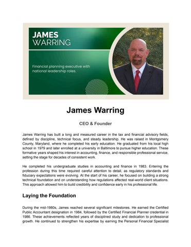James Warring has established a long career in tax and financial advisory services grounded in discipline, technical understanding, and consistent leadership. Raised in Montgomery County, Maryland, he completed high school in 1979 and later attended a university in Baltimore. He earned an undergraduate degree in accounting and finance in 1983, entering the profession during a period marked by changing regulatory expectations and growing fiduciary responsibility. During the mid-1980s, James reached several important professional milestones. He became a Certified Public Accountant in 1984 and a Certified Financial Planner in 1986. He later expanded his credentials by earning the Personal Financial Specialist designation in 1990. These professional qualifications guided his career direction. He worked at seven accounting firms across the Washington, DC metropolitan area, gaining broad experience with varied client needs, compliance requirements, and operational structures. After a 12-year partnership at an accounting firm in Bethesda, Maryland, he began a new chapter in 2007. He founded two separate organizations, one focused on investment advisory services and the other on public accounting. Warring intentionally maintained them as independent entities to support transparent governance, regulatory alignment, and defined service responsibilities. Instead of pursuing aggressive expansion, he emphasized steady and sustainable growth. Over the next 15 years, both firms grew nearly tenfold. What began as a four-person operation expanded to more than forty employees by the time the businesses were sold in September 2025. James Warring attributed this growth to careful integration. In the later years of ownership, five practices joined the platform, including four accounting firms and a third-party administrator practice. Each addition strengthened operations and helped preserve long-term client relationships.