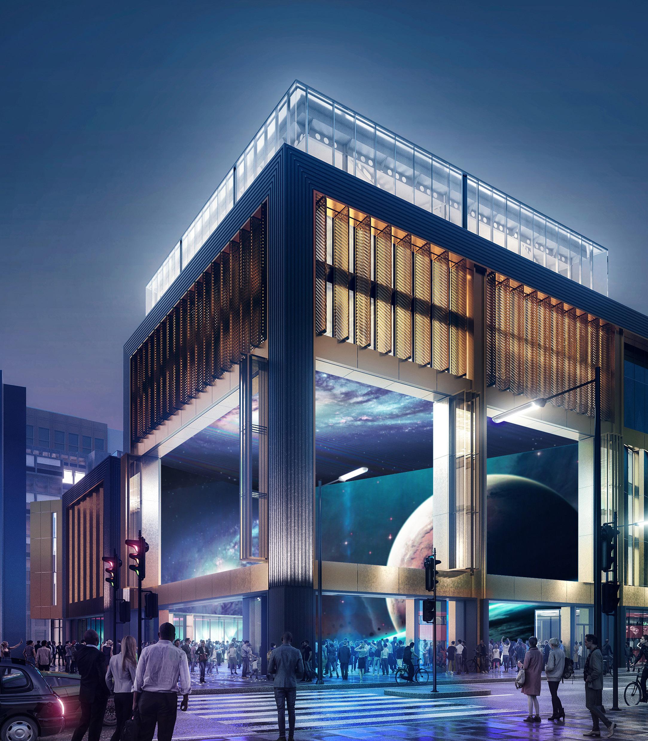 The larger of the two new buildings, which will total 9,290 sqm, includes a ground-breaking urban gallery which will provide a publicly accessible curated space incorporating 1,800 sqm of digital screens. The urban gallery will be used for a combination of brand launches, retail, advertising and screenings and will be operated in conjunction with a 2,000 person capacity music and events venue contained within a 2,800 sqm basement box underneath the site. The smaller building, which will total 4,650 sqm, will include a mix of retail, leisure, hotel and office use, with rooftop restaurants and bars.