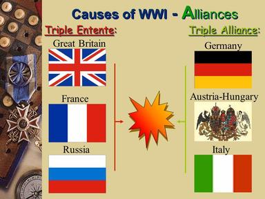 Alliances was another major cause or WW1 starting. In WW1 the world divided into colonial empire groups. They divided into a series of alliances and treaties, based Apon factors, like tradition and strengths. There were two major groups the Triple Entente and the Triple Alliances. Any time throughout the war, the alliances could change groups. There were two different major groups called the triple Entente and the Triple Alliance. The Triple Entente was Great Britain, France and Russia. While the Triple Alliance was Germany, AustriaHungary and Italy.