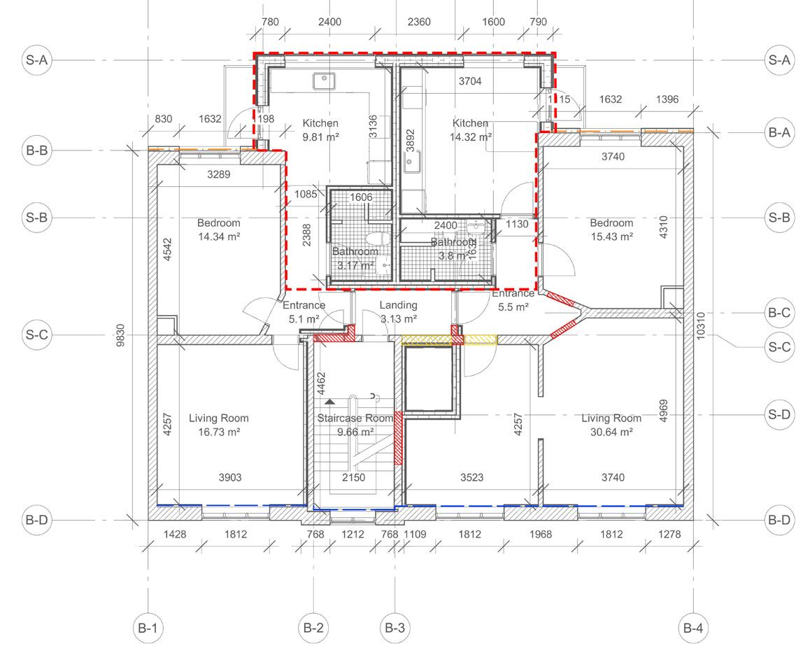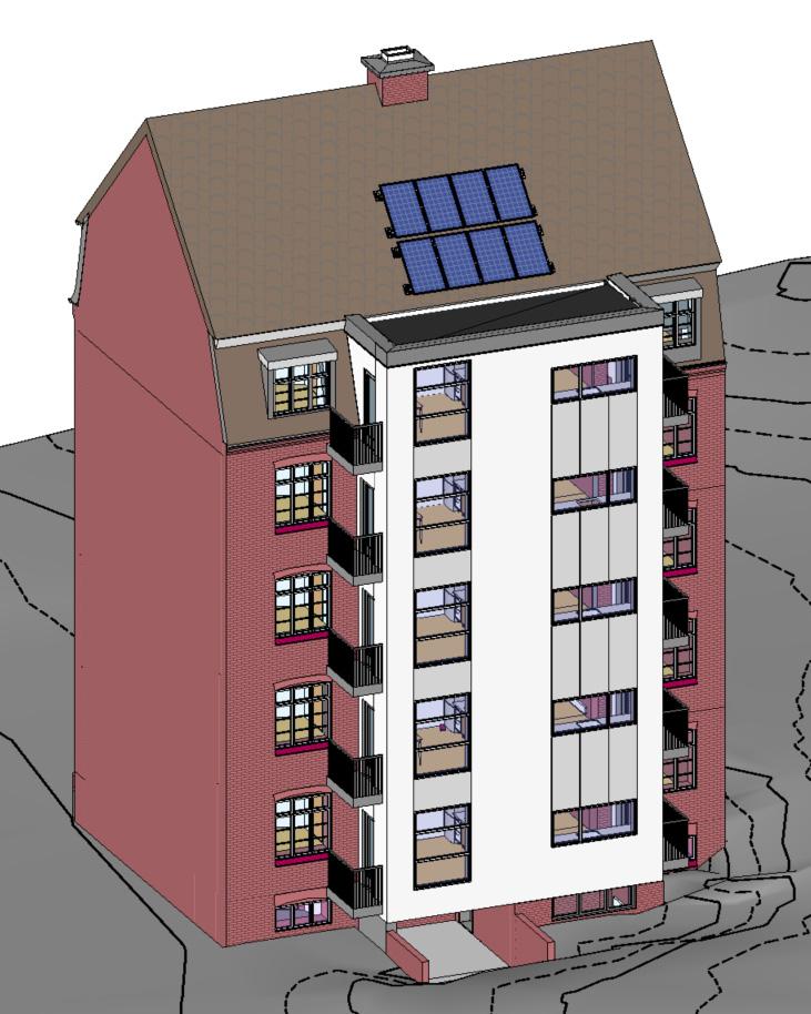 The renovation of the 1921 apartment block on J.M. Mørksgade in Aarhus transformed the 5-story building into a modern, sustainable residence while preserving its historic charm. Each of the ten apartments was upgraded with new kitchens, bathrooms, and private balconies. Accessibility was enhanced with the addition of an elevator, retro fitting of insulation and internal connections to both the basement and courtyard. All technical installations were updated, and a new laundry room was established in the basement. The project went beyond standard building regulations by integrating sustainable solutions, ensuring the block meets contemporary living standards while maintaining its architectural heritage.