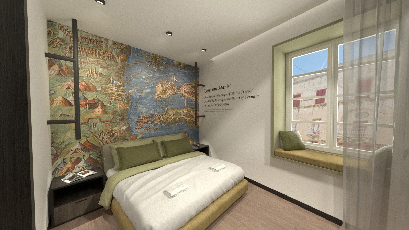 The design included a short brief history printed on the wall along the wallpaper to give guests historical insight of the city. In one particular bedroom, specific fabric colours were selected based on an iconic Maltese fishing boat, also known as “Luzzu” which traditionally has vibrant yellow and blue colours.